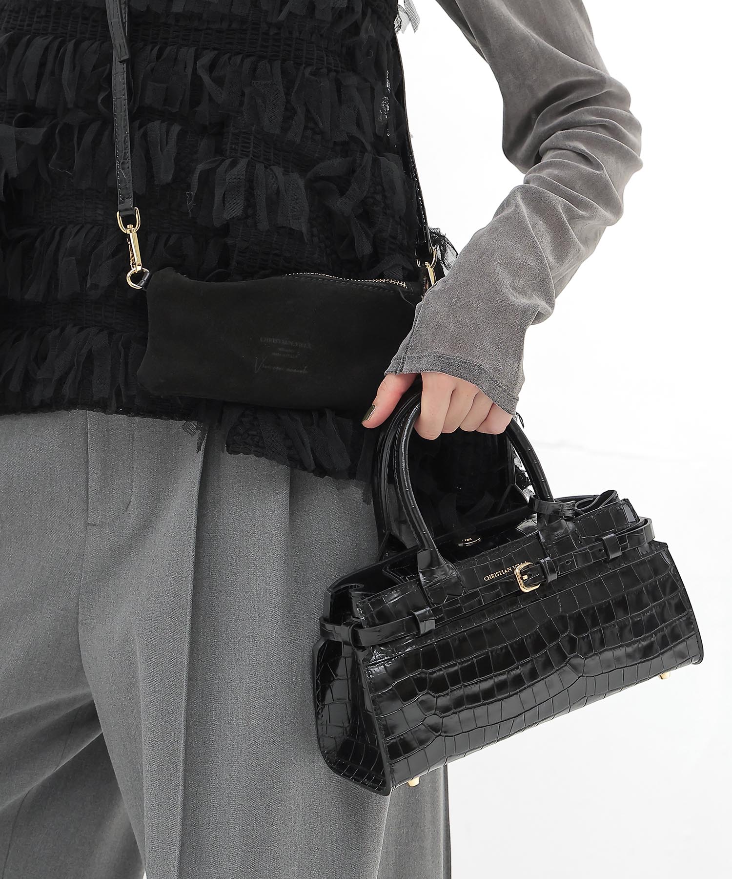 光沢のある素材感で、着用すると一気にモードな印象となります。