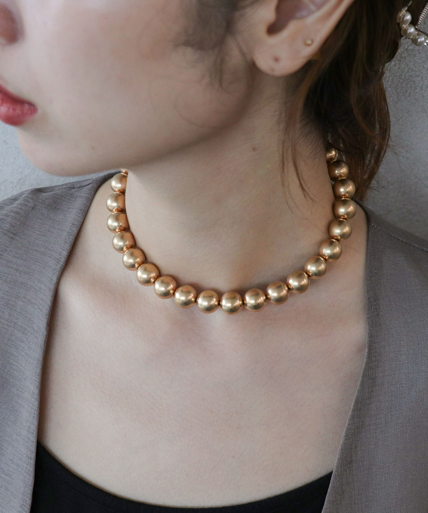 小物→バッグ、イヤリング、ネックレス、全てゴールドで統一感を出しました。