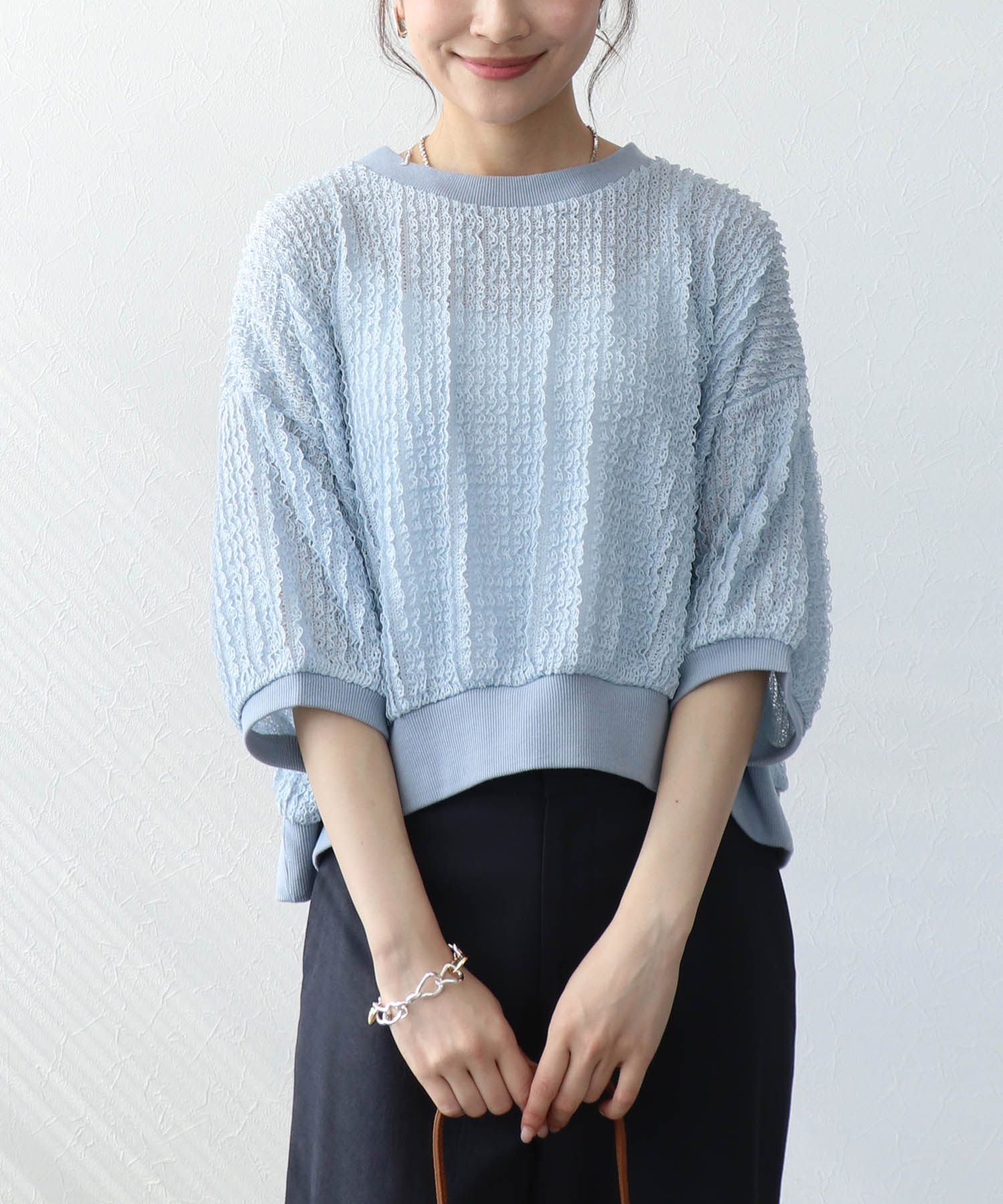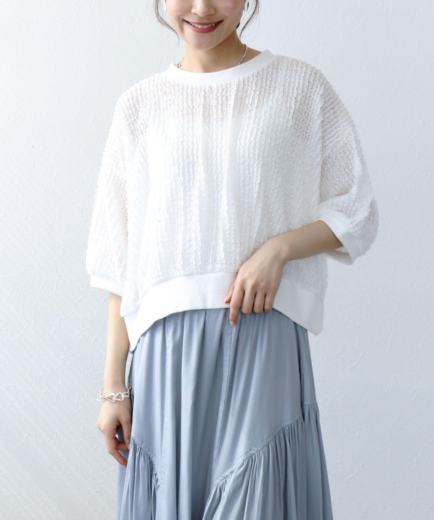 ほどよい透け感で、インナーとのレイヤードも楽しめるデザイン。