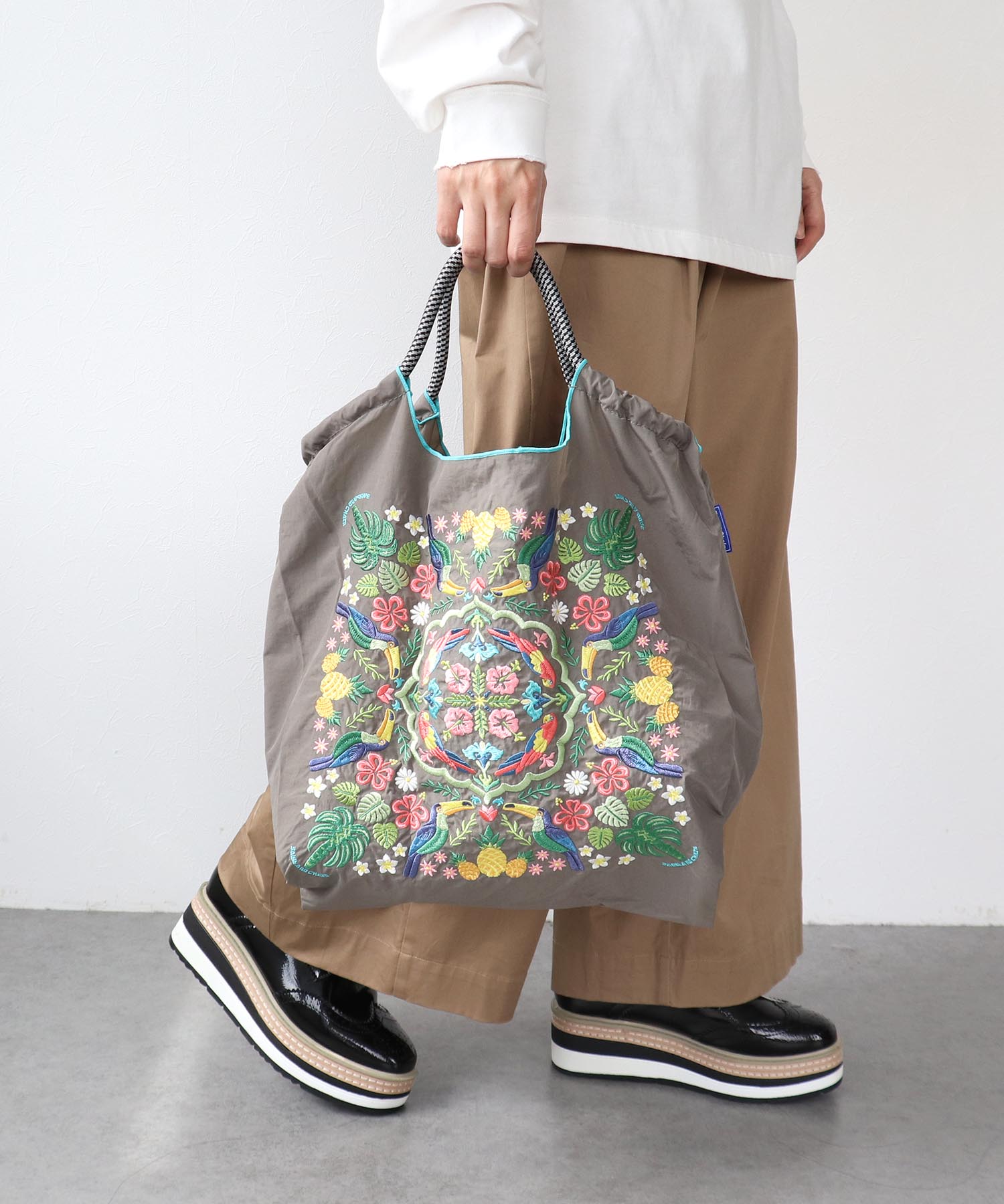 グラフィックデザインをそのまま「刺繍」で施すことで、高級感がありデザイン性の高いショッピングバッグを作りました。
