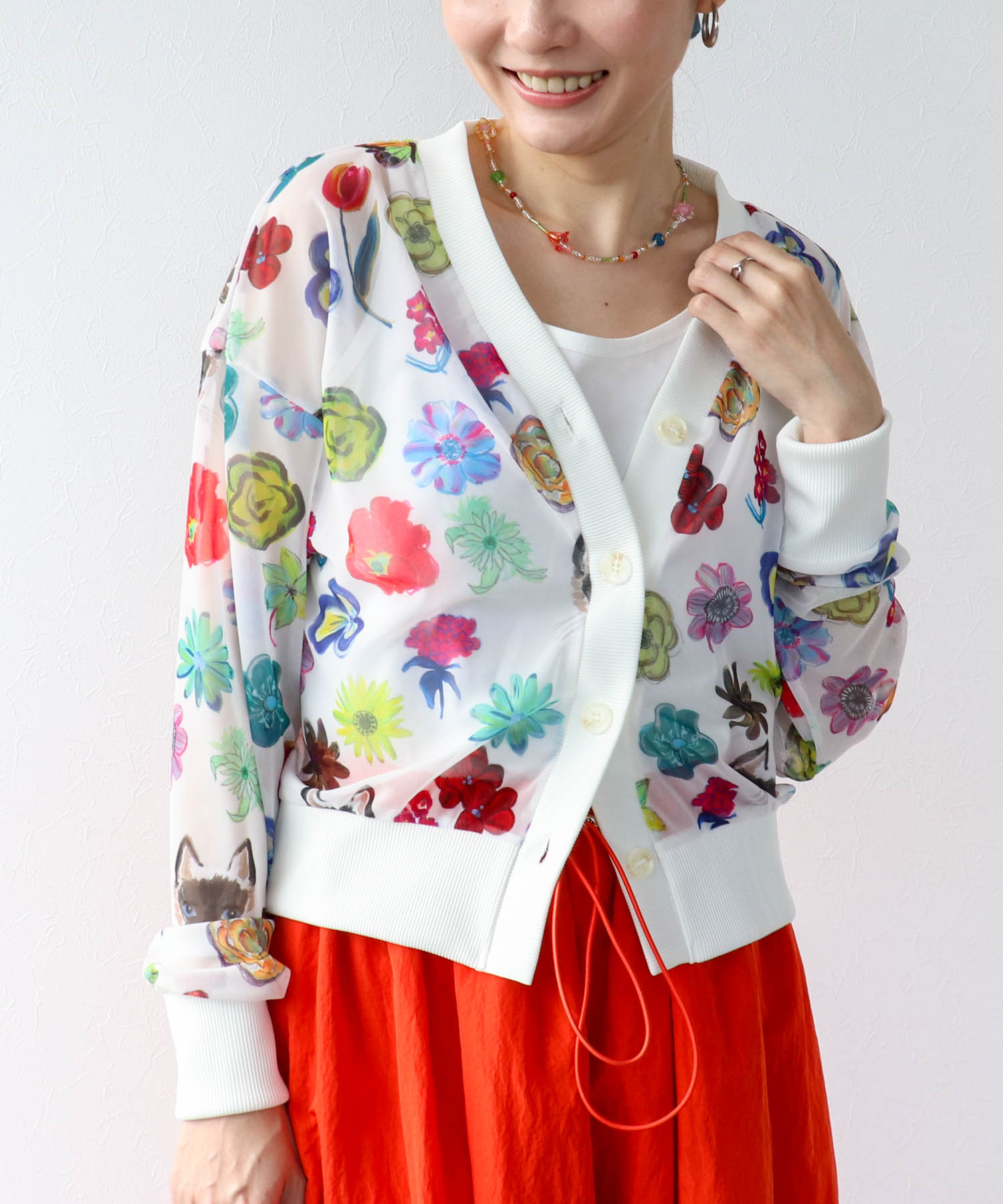 華やかなプリントが映えるシアーデザインカーディガン