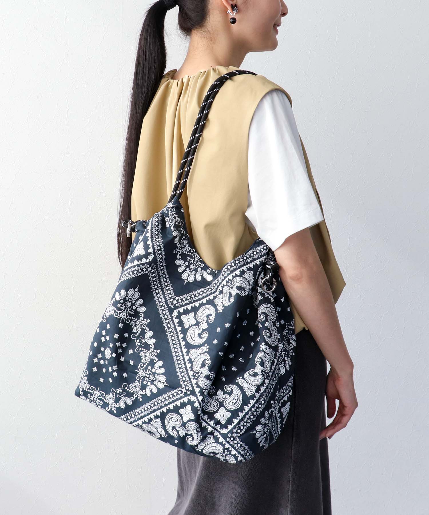 バンダナ柄とパラコードのコントラストがアクセントになり、シンプルなコーディネートも一気におしゃれに仕上がるおすすめバッグ。