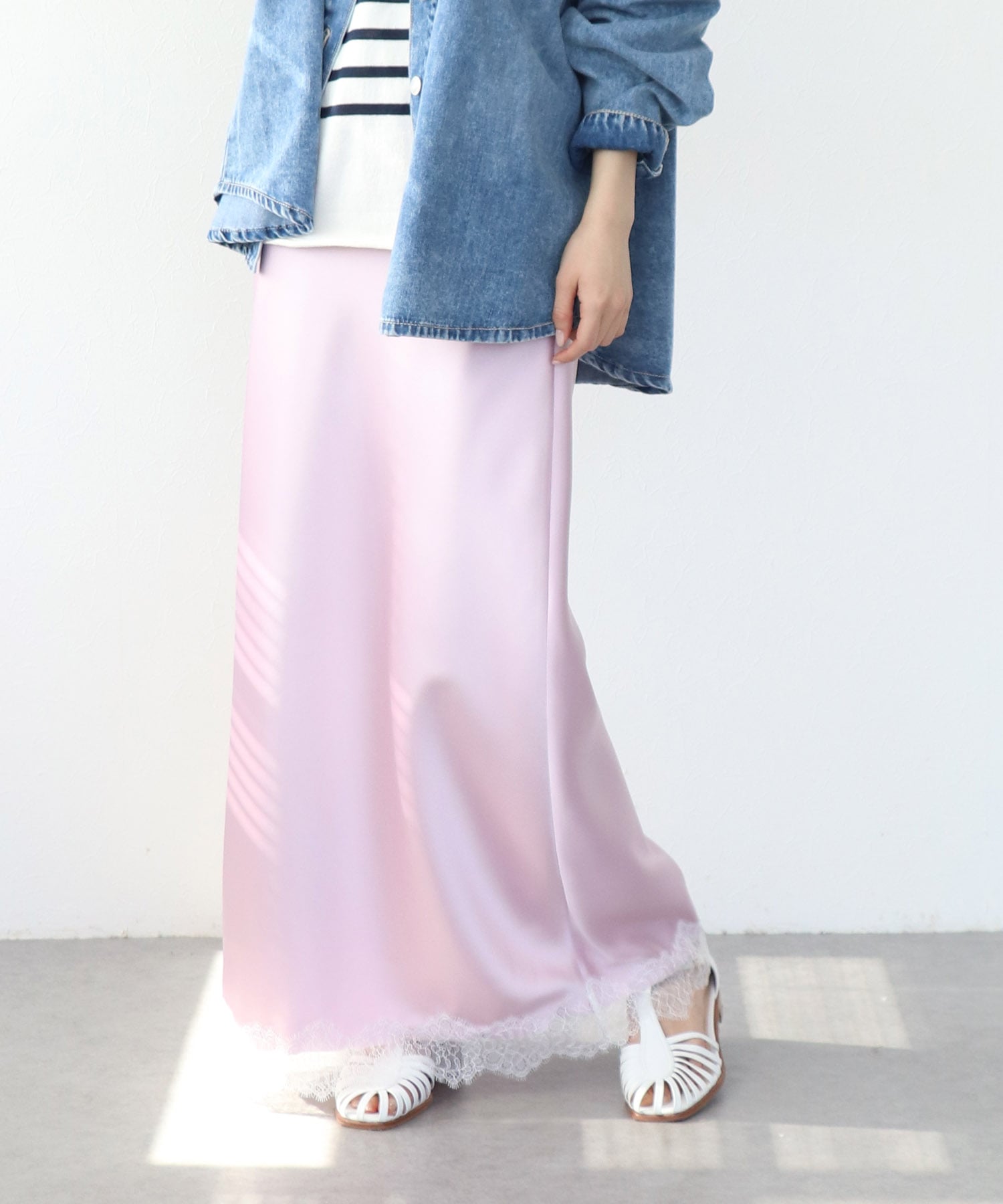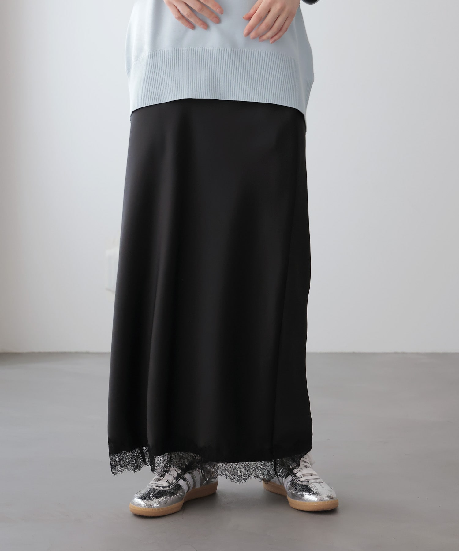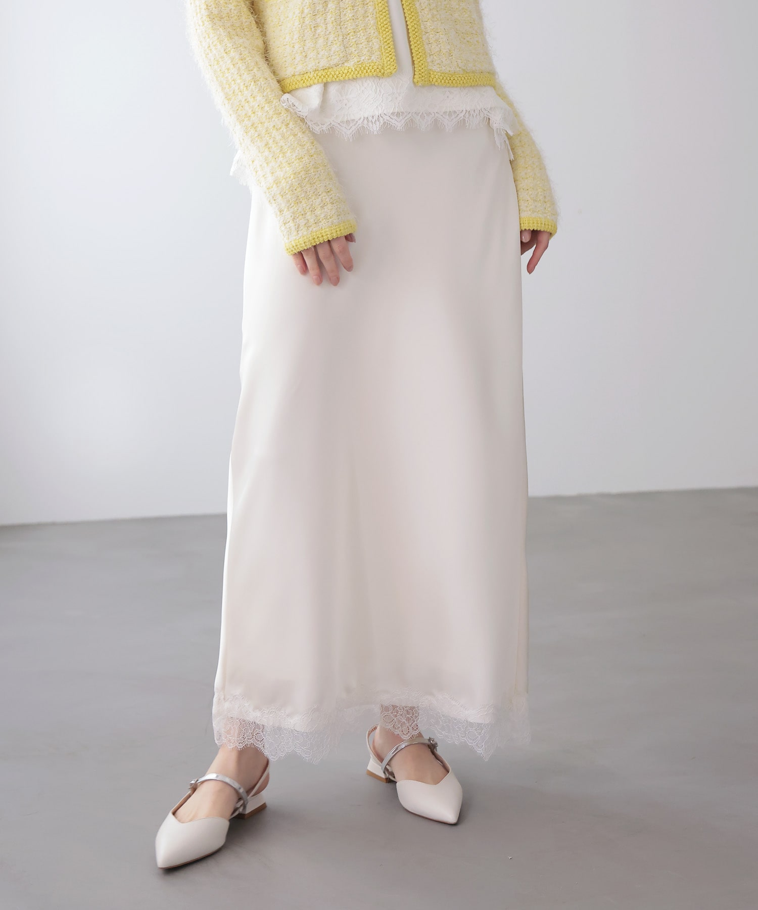 なめらかなサテン素材に、裾のみ繊細なレースをあしらったバイアススカート。