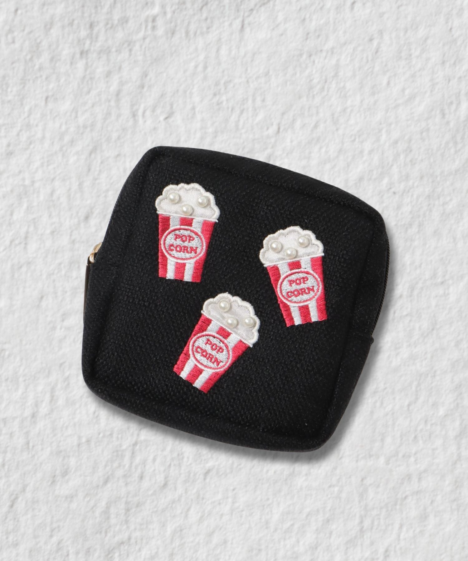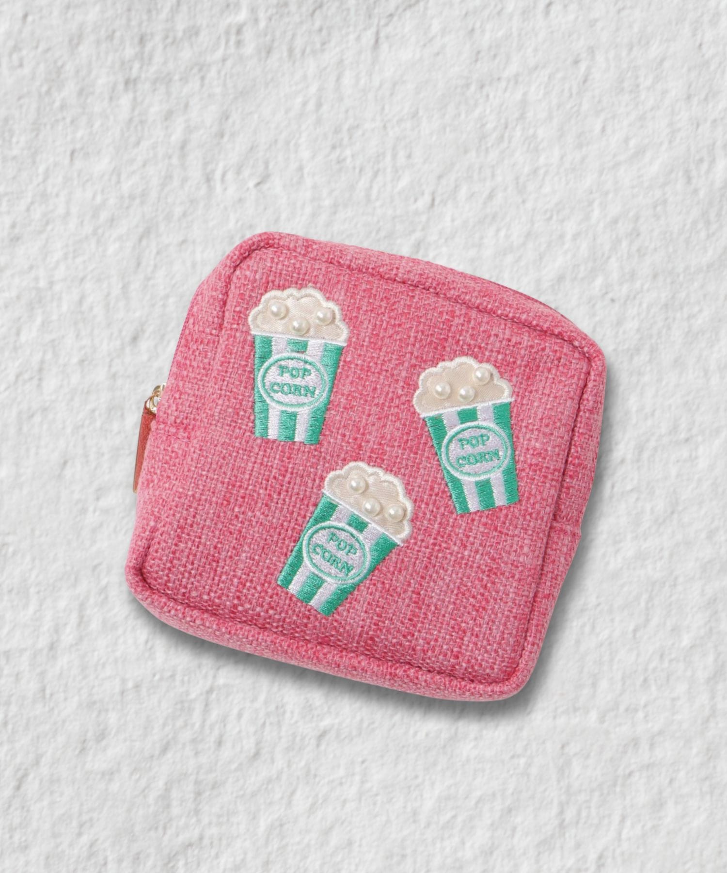 パールのビーズが今にもはじけ飛びそうな雰囲気のポップコーンモチーフが愛らしいデザインのスクエア型ポーチ。
