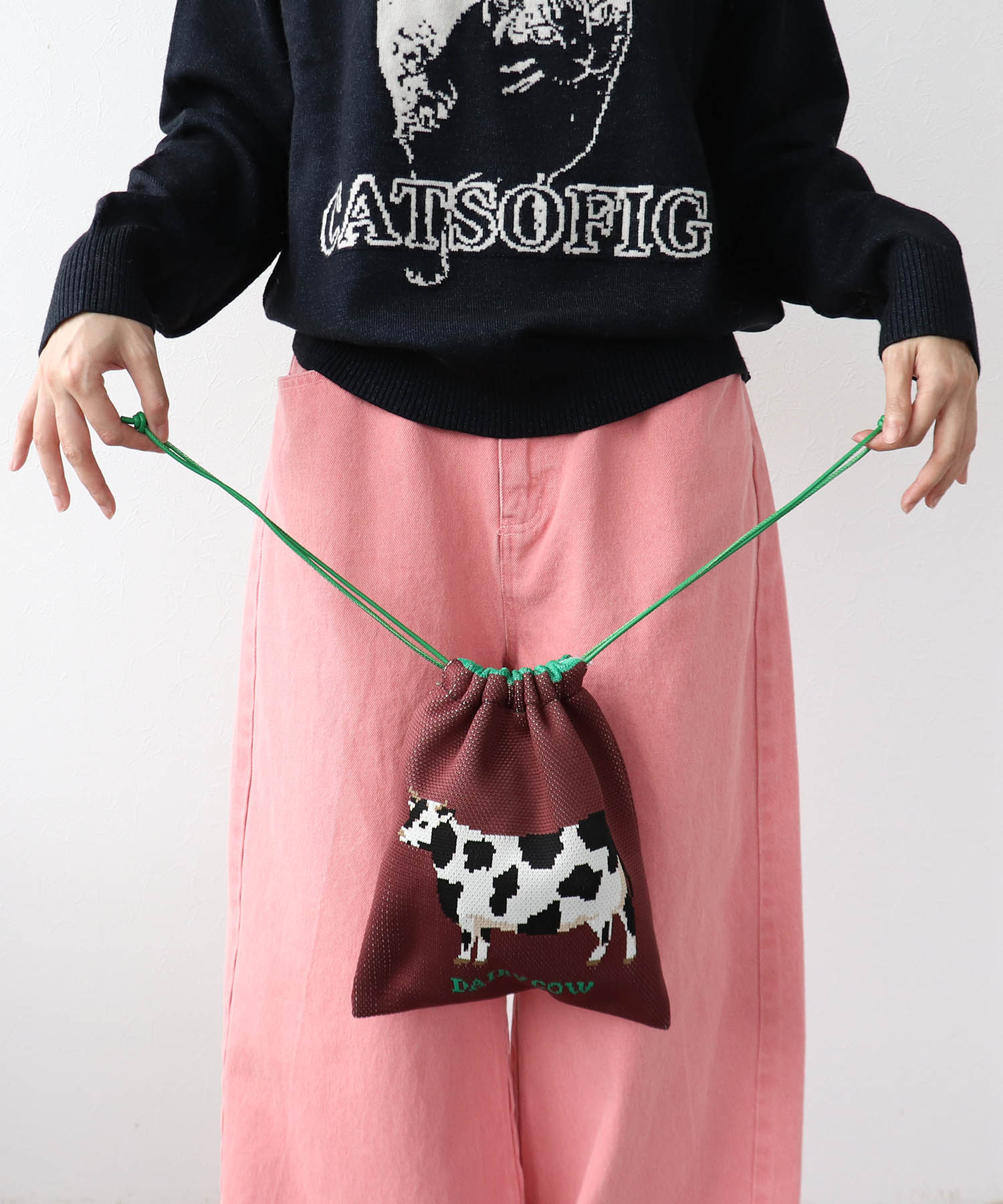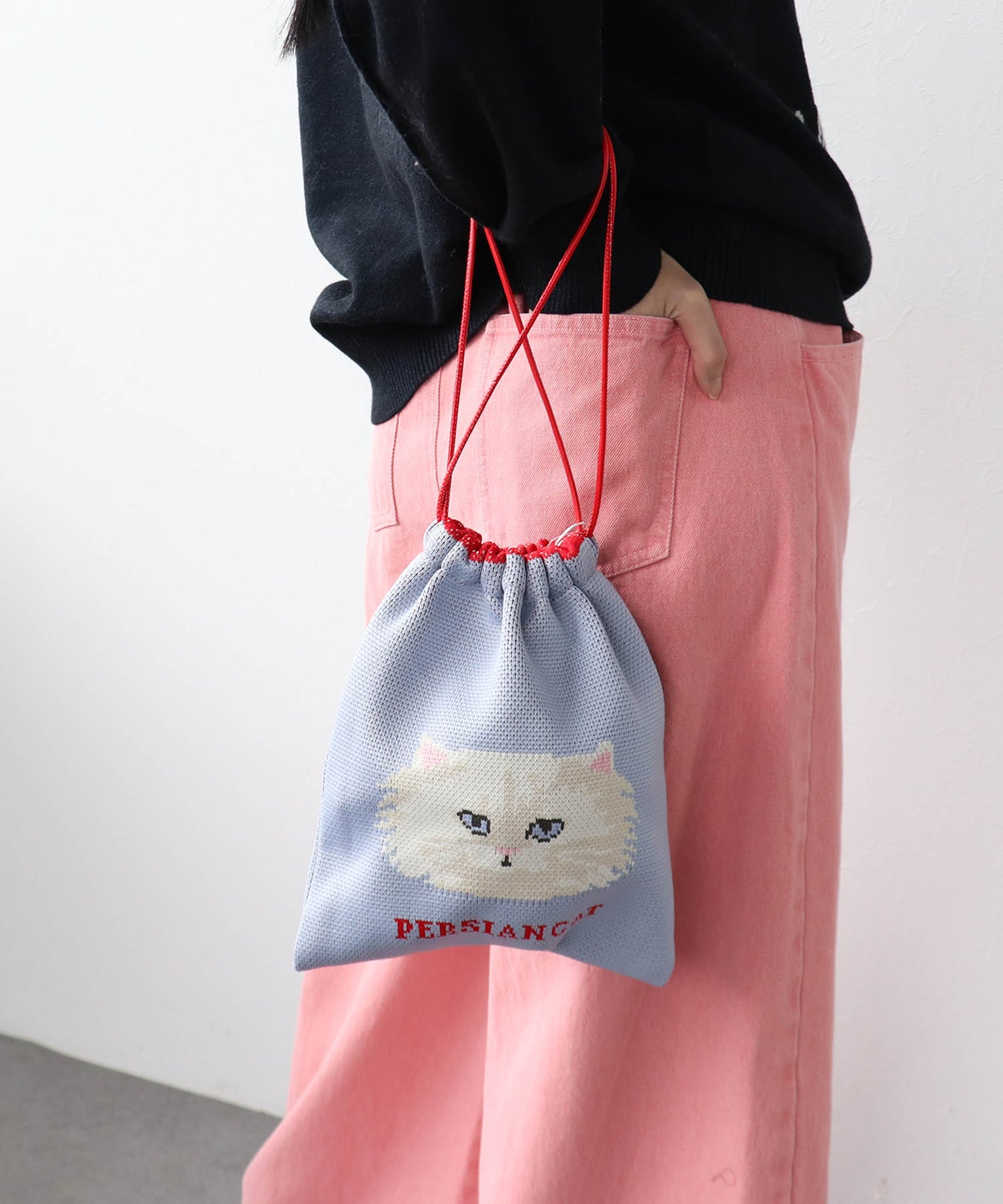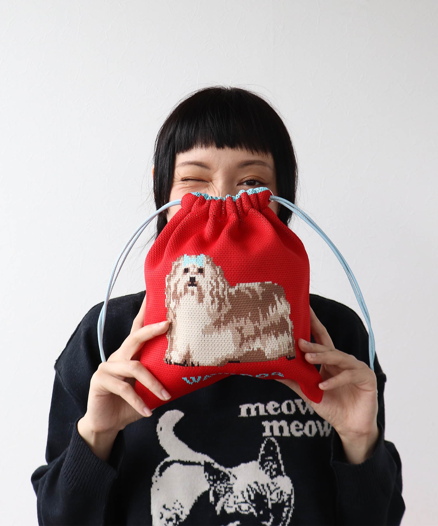 ユーモラスなイラストのジャガード編み巾着