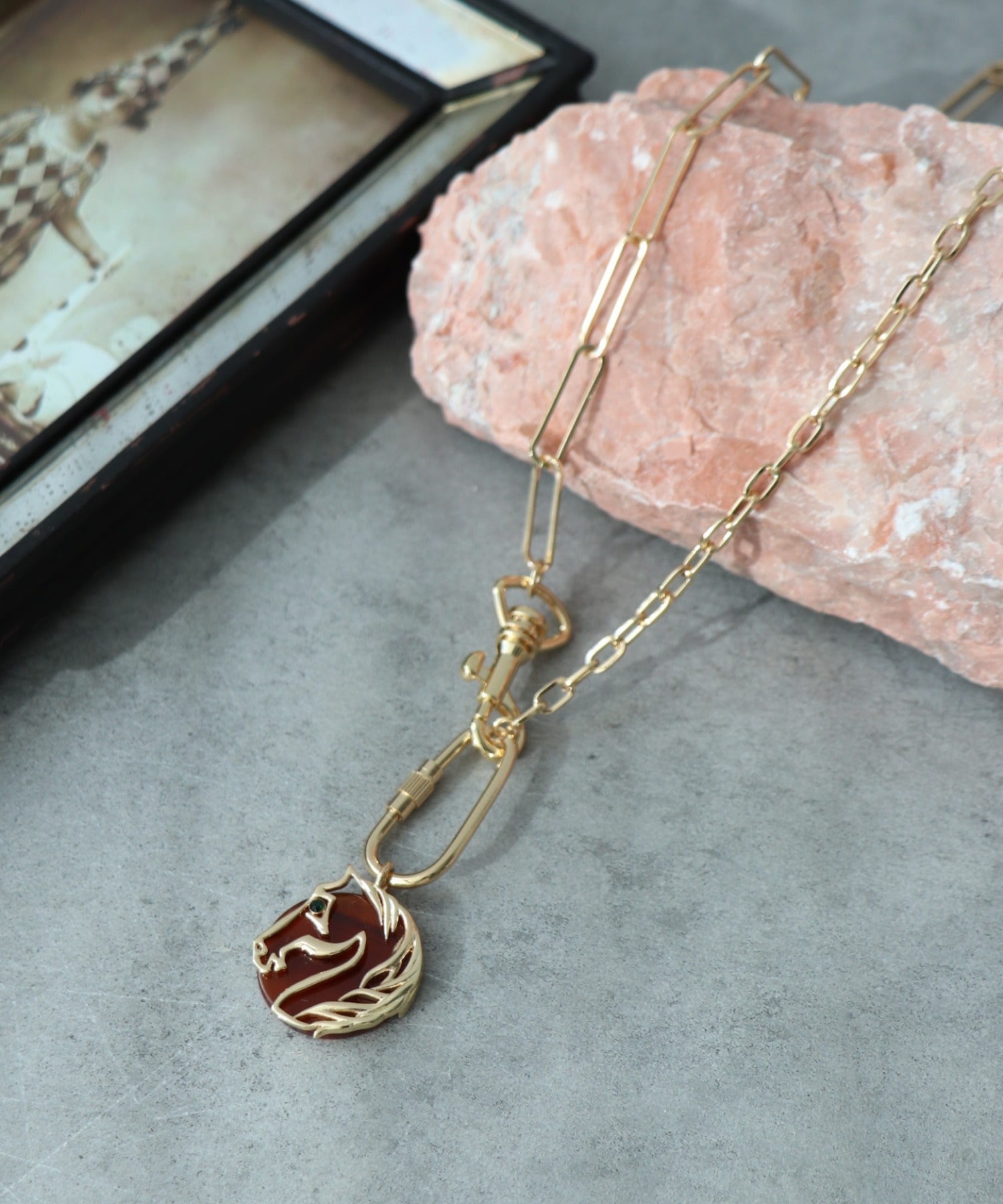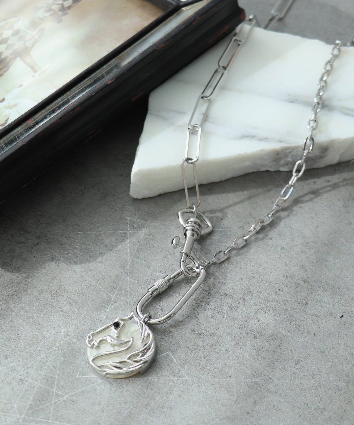2種類のチェーンを組みわせ、カラビナをポイントとしたスタイリッシュなデザイン。