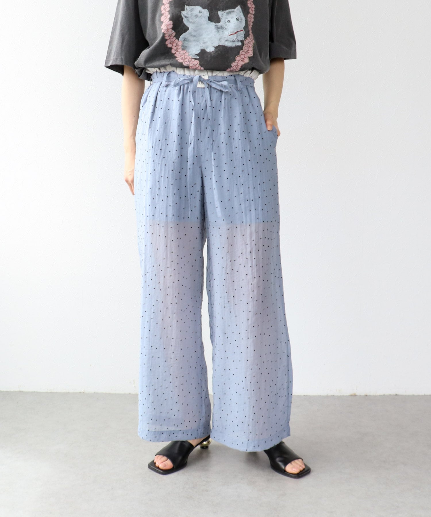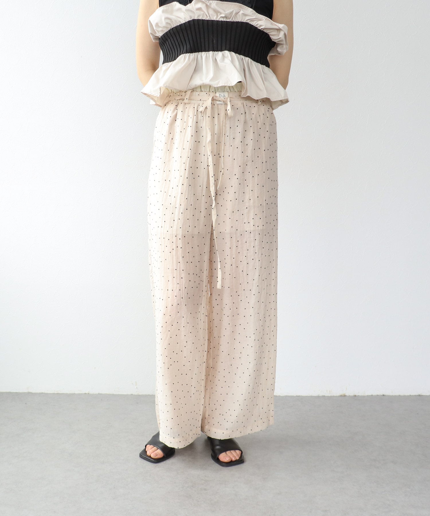 ドット柄とウエストフリルがポイントのワイドパンツ