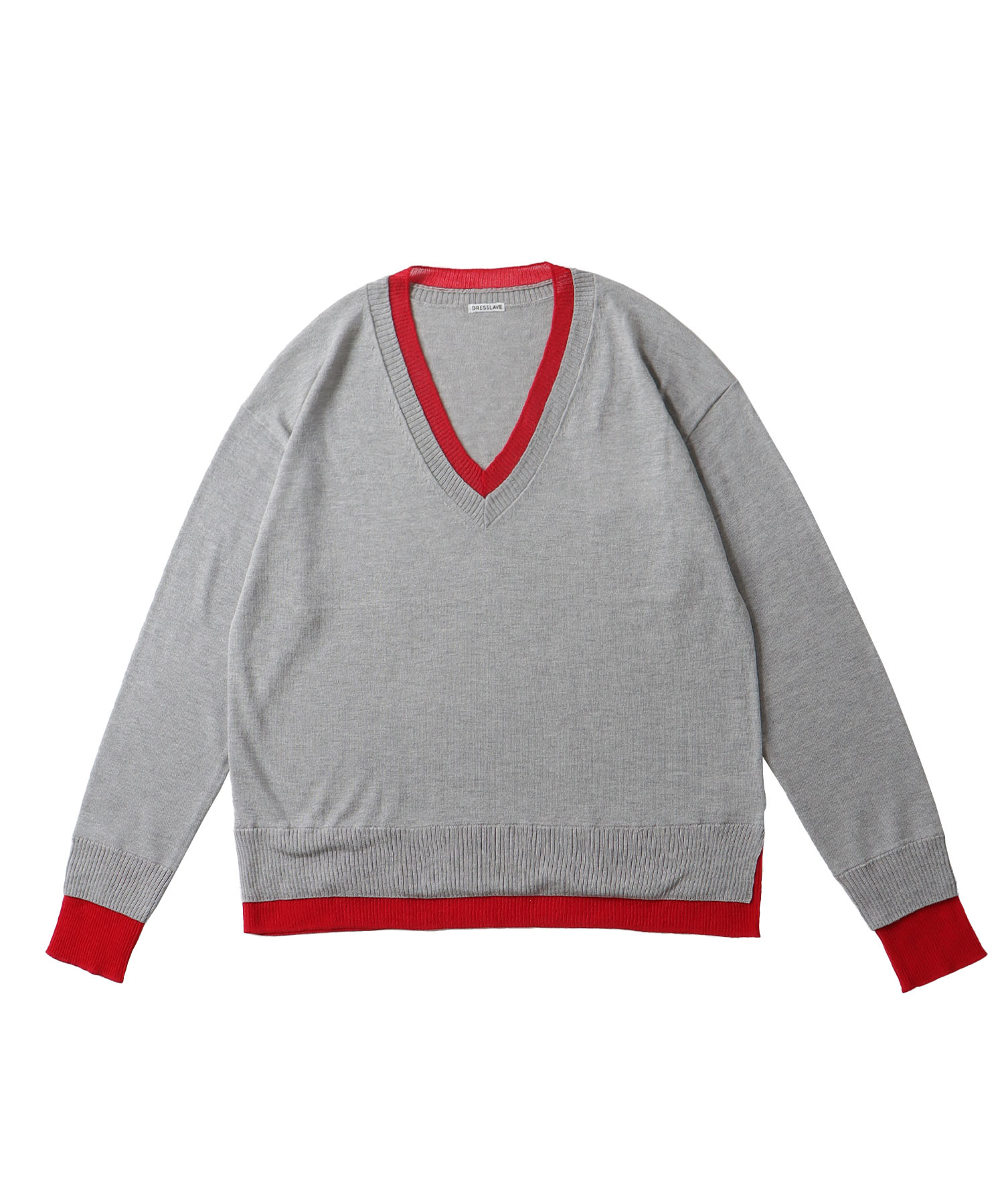 配色インナーを重ね着しているように見えるデザインのVネックプルオーバー。