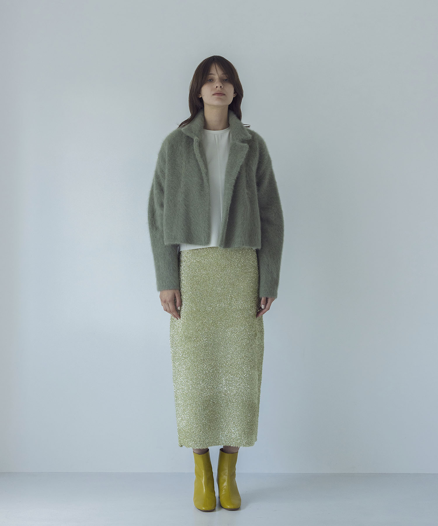 表側はメタリックなシャギーヤーンを使用し、裏側はポリエステル100%の糸を使用したニット。