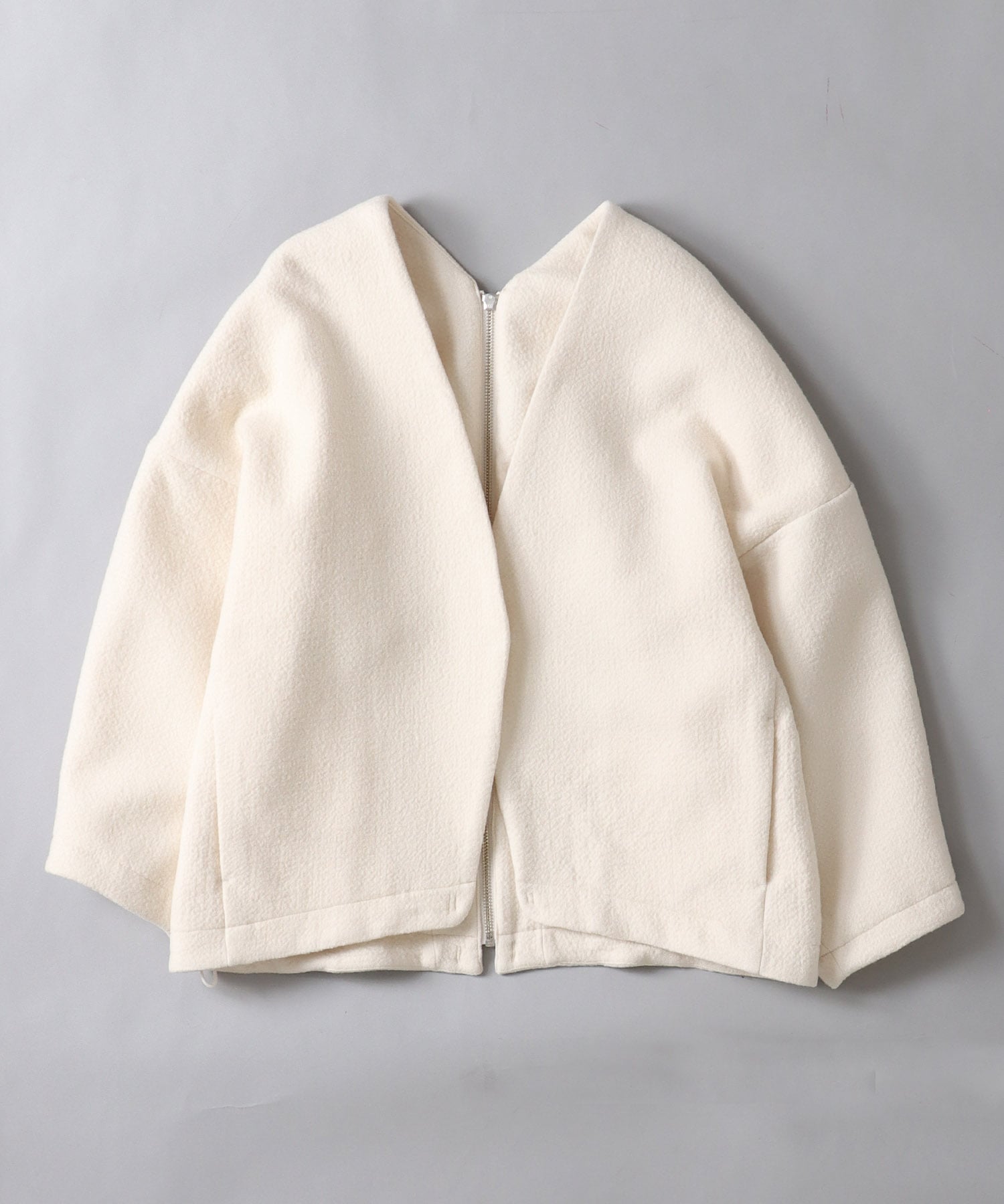 ノーカラーブルゾンを羽織っているような、ライトな見えがかりのショートコート。