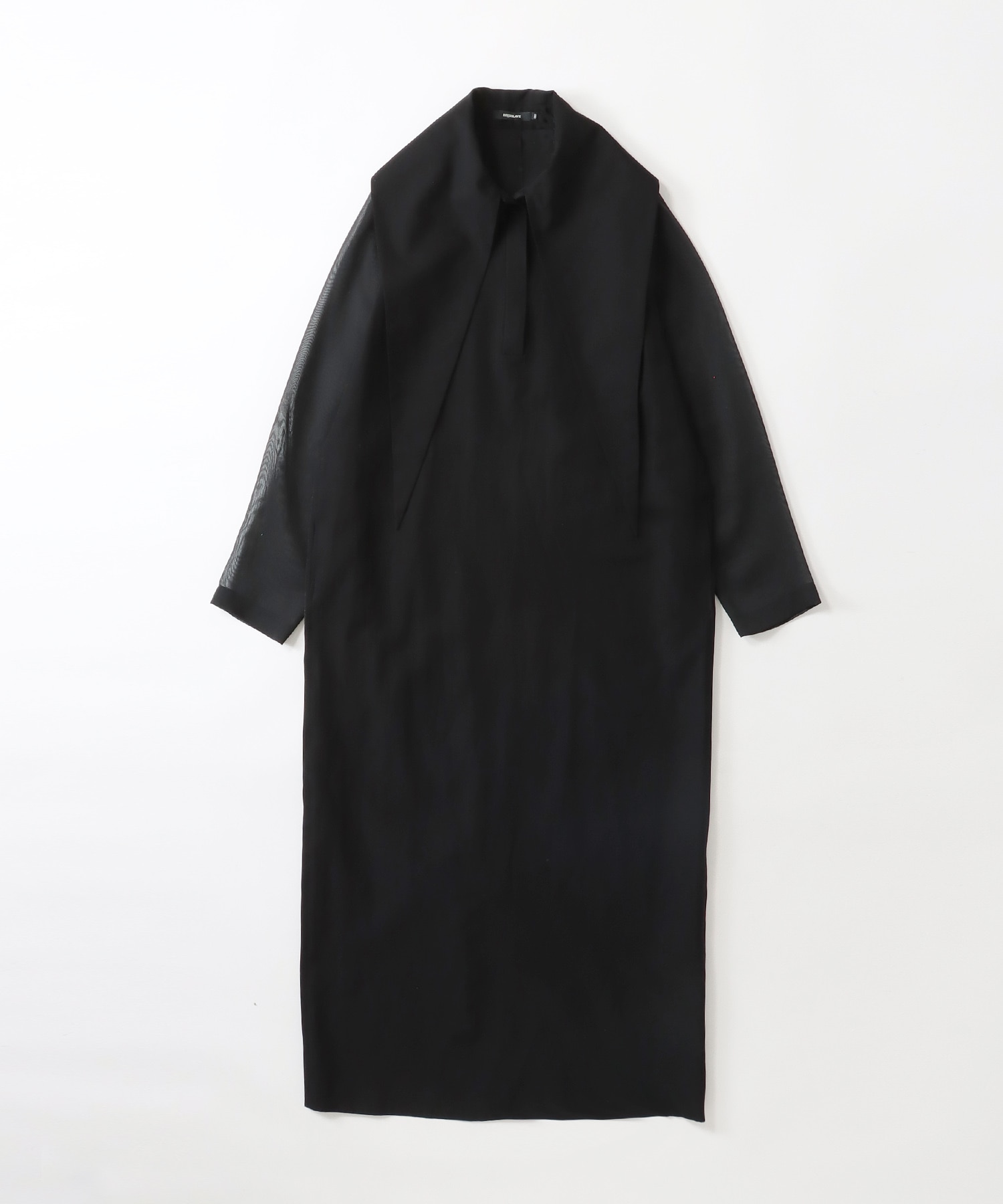 ストレートロングシルエットとスカーフ襟によって縦長効果を演出。