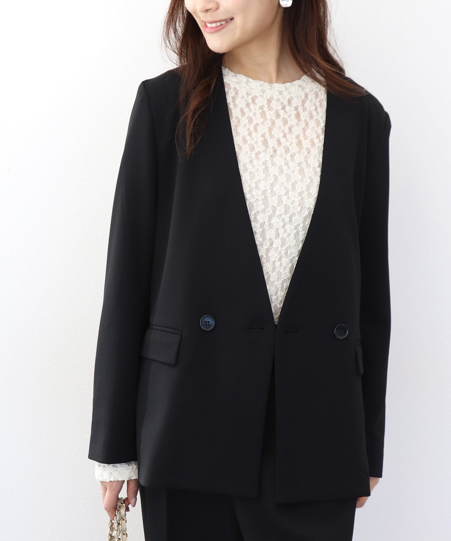 深めのVラインが顔まわりをすっきりと見せ、インナー次第でオフィスからセレモニー、デイリーまで幅広く活躍します。