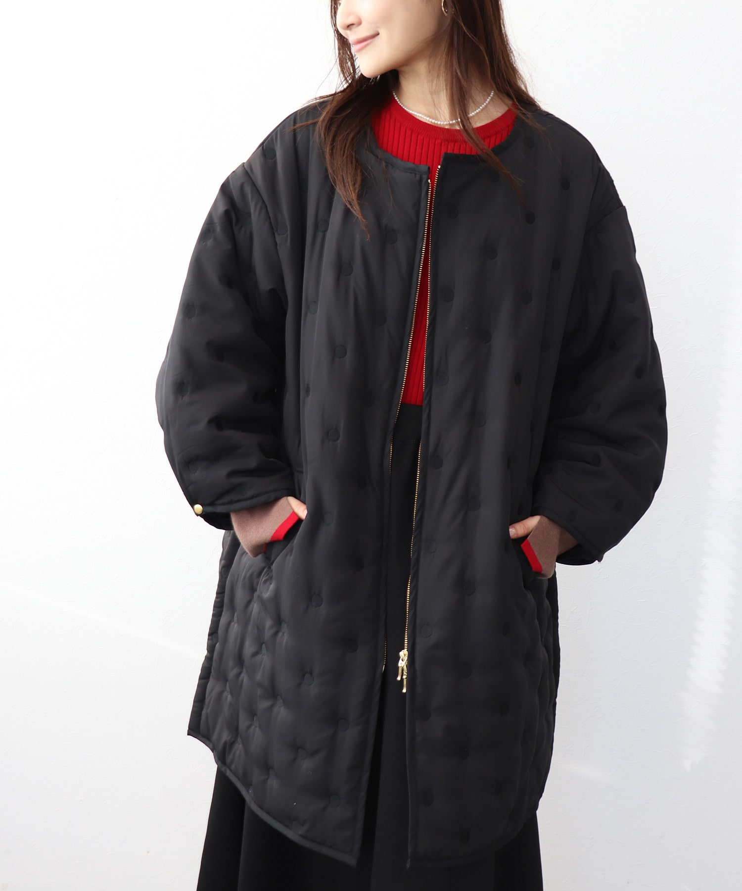 ふんわりとしたキルティングに、ドット刺繍を施したフェミニンなノーカラーコート。