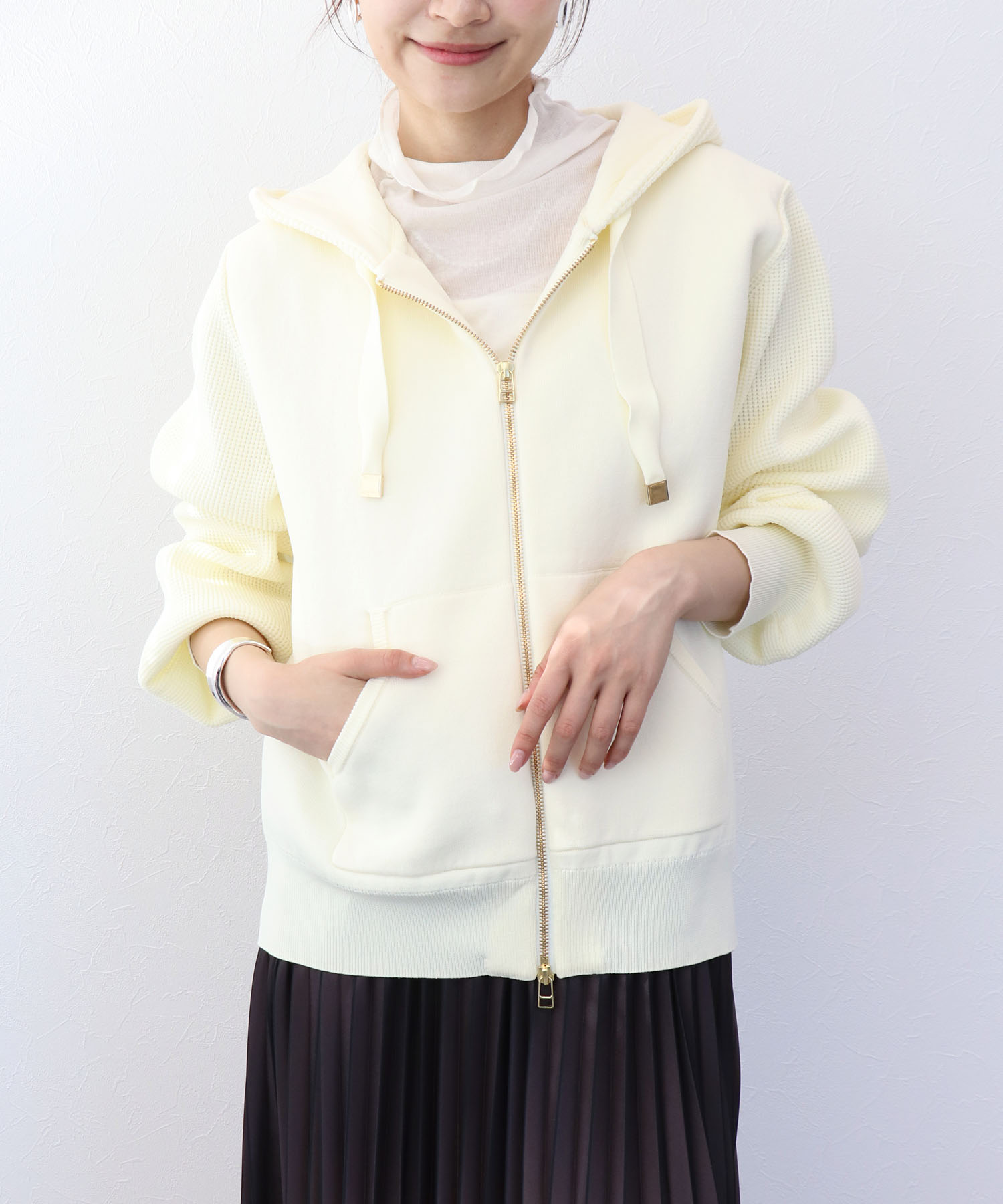 カジュアルなフーディデザインながらも、ニットならではの上品な質感が大人のリラックススタイルにマッチします。厚すぎず軽やかな着心地で、季節の変わり目にも活躍する万能アイテムです。