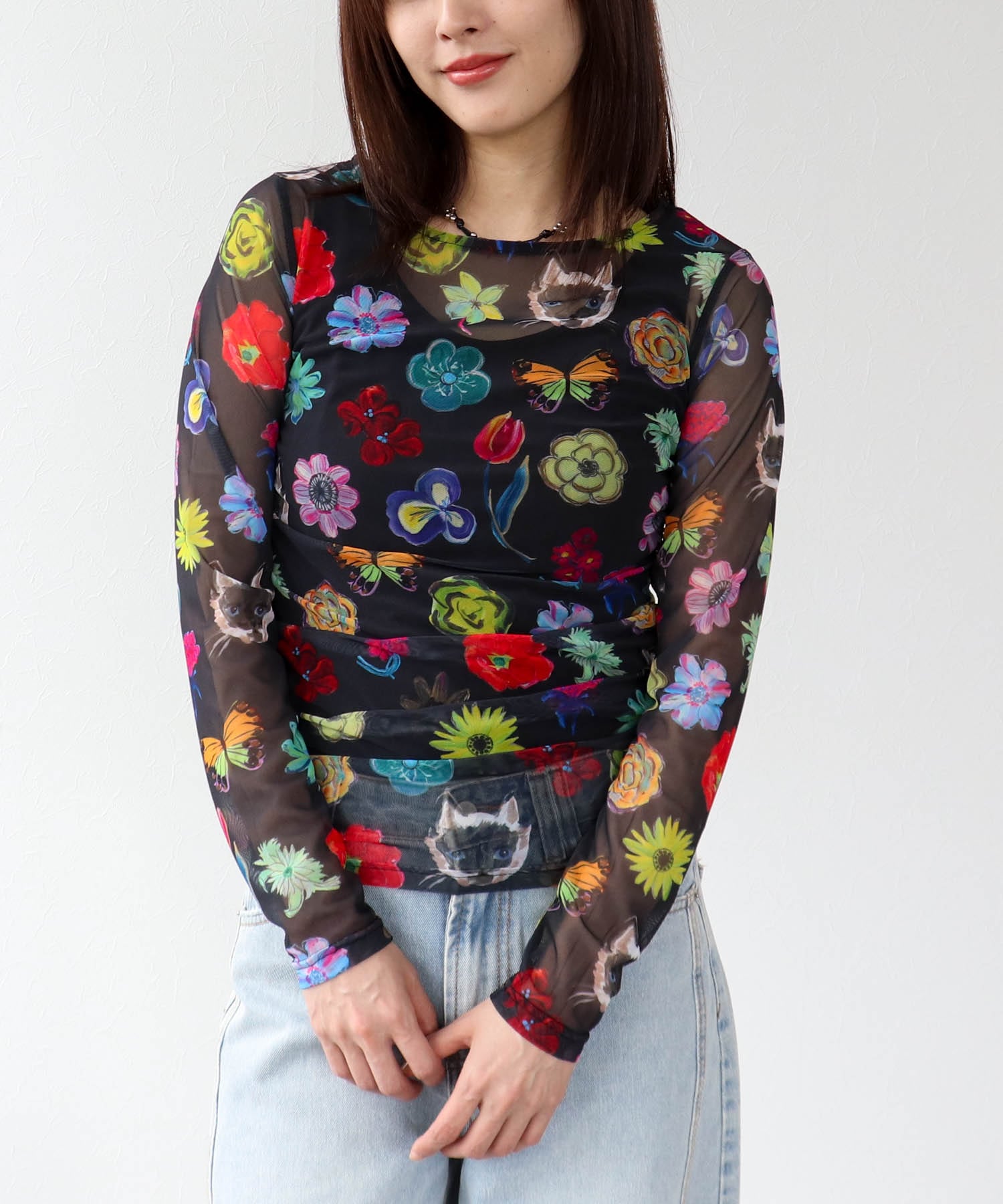 繊細なシアー素材に、色鮮やかな柄が重なりコーディネートの主役に。