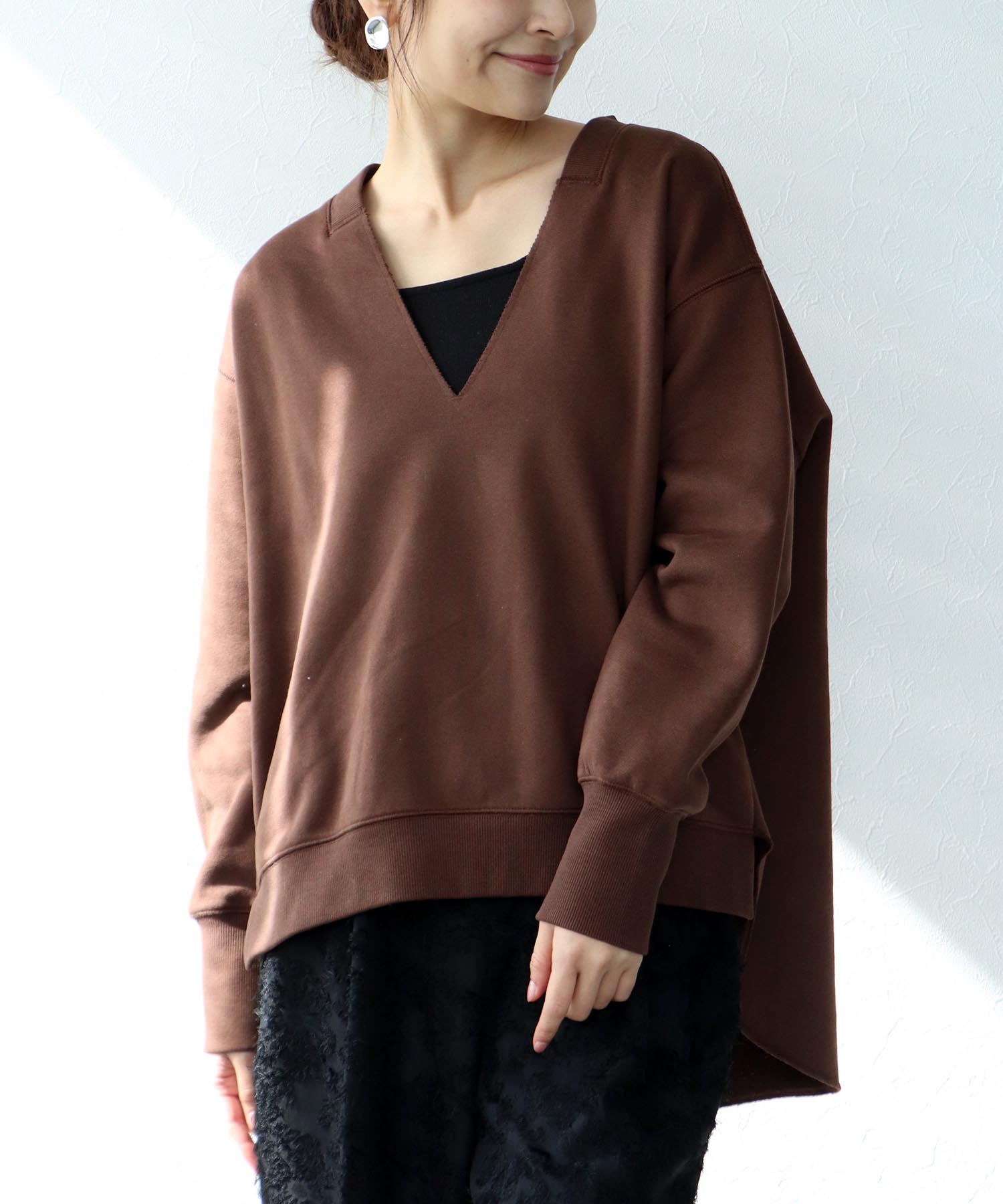 ふっくらとした裏毛素材で仕立てられたVネックプルオーバー。