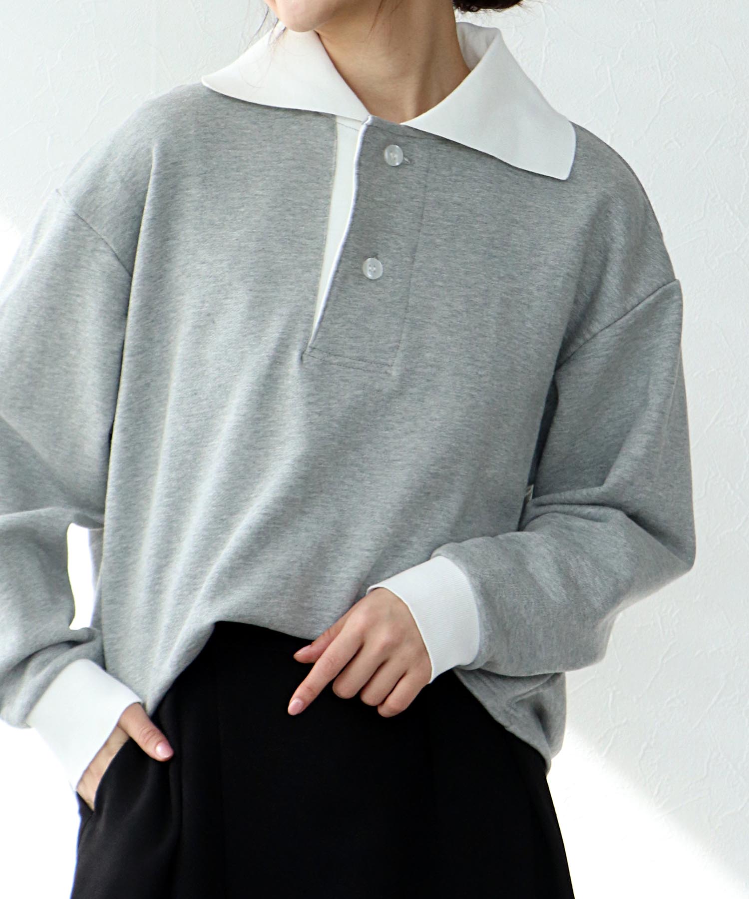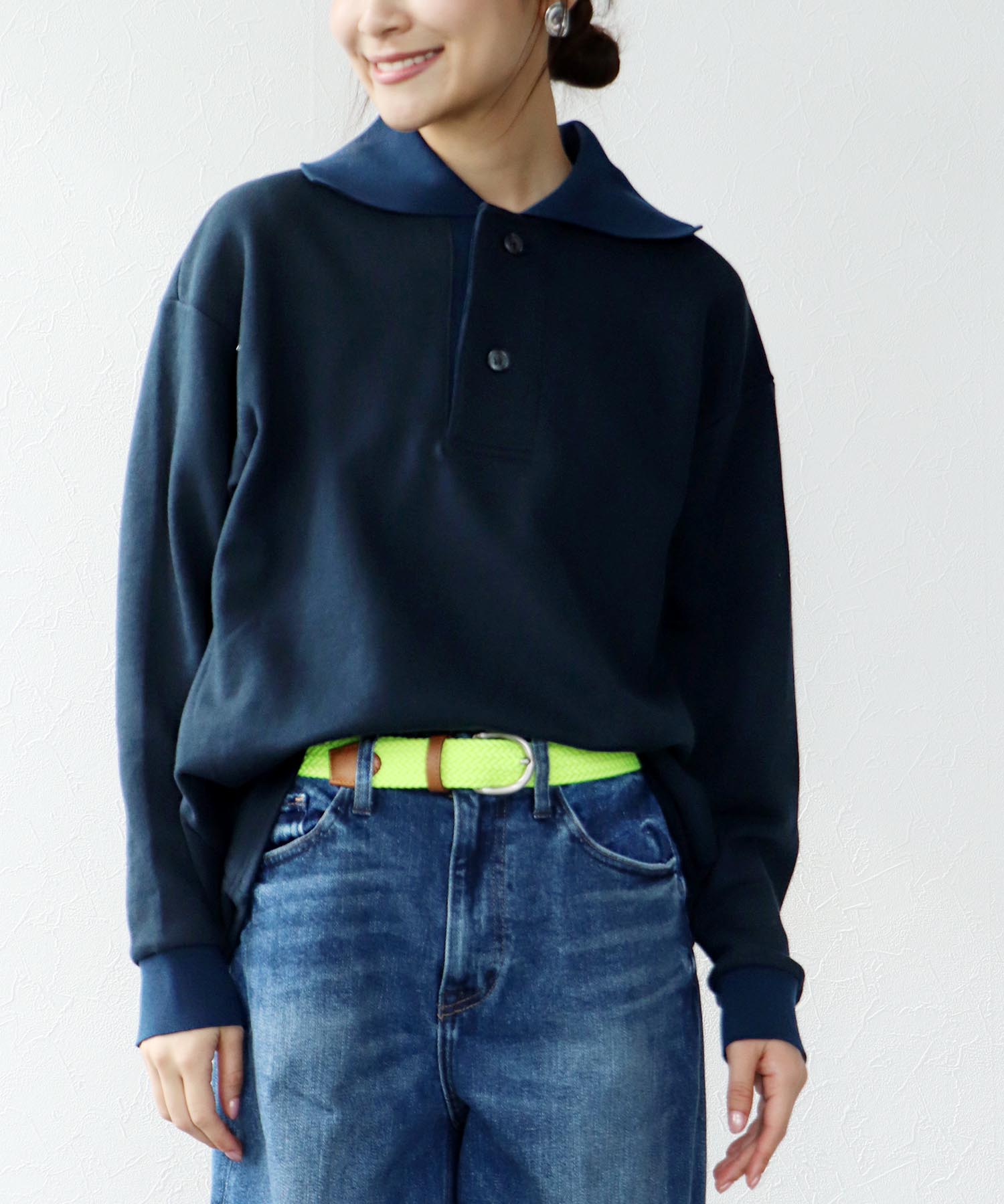 裏毛素材をベースに、ポロシャツのような衿付きデザインをプラスしたプルオーバー。