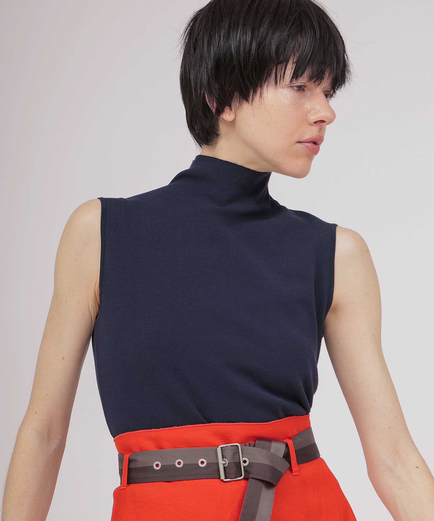 コットンアセテートのさらりとした肌触りが、春夏シーズンに心地よいハイゲージのスリーブレスプルオーバー。