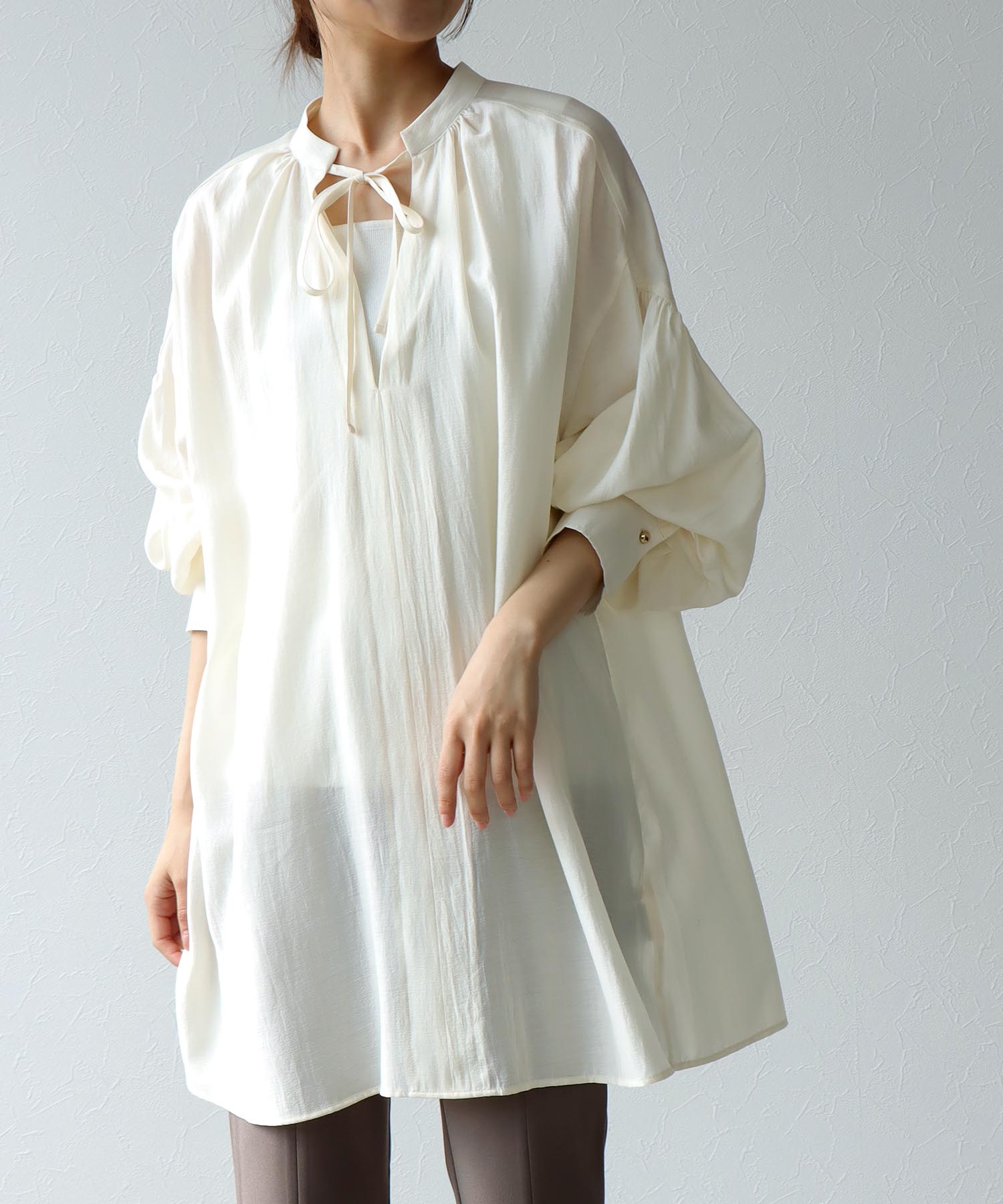 抜け感のあるスキッパーデザインで、顔まわりをすっきりと見せてくれるチュニックブラウス。
