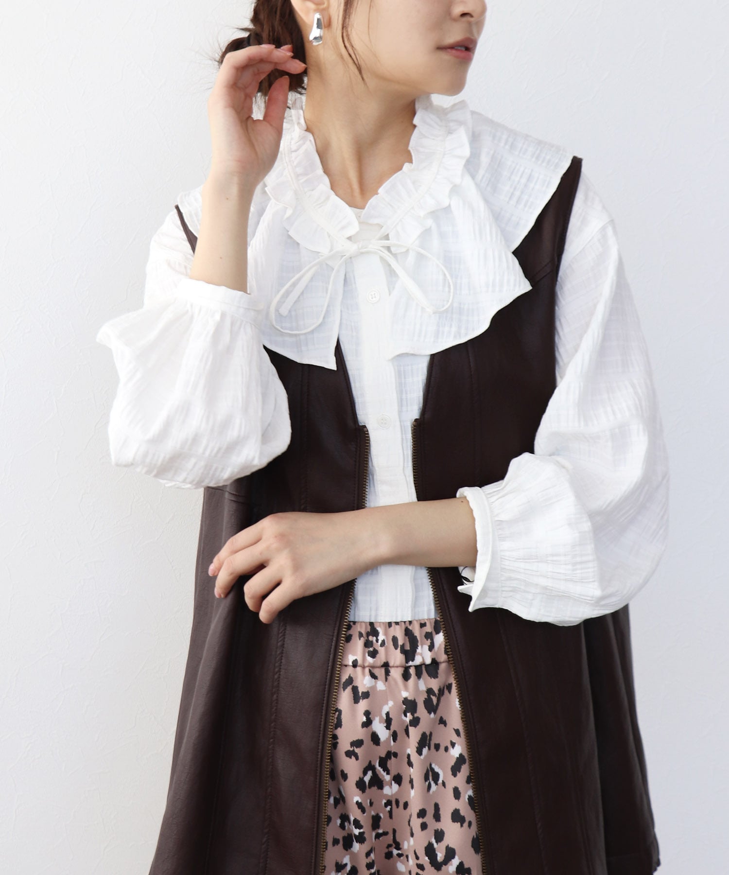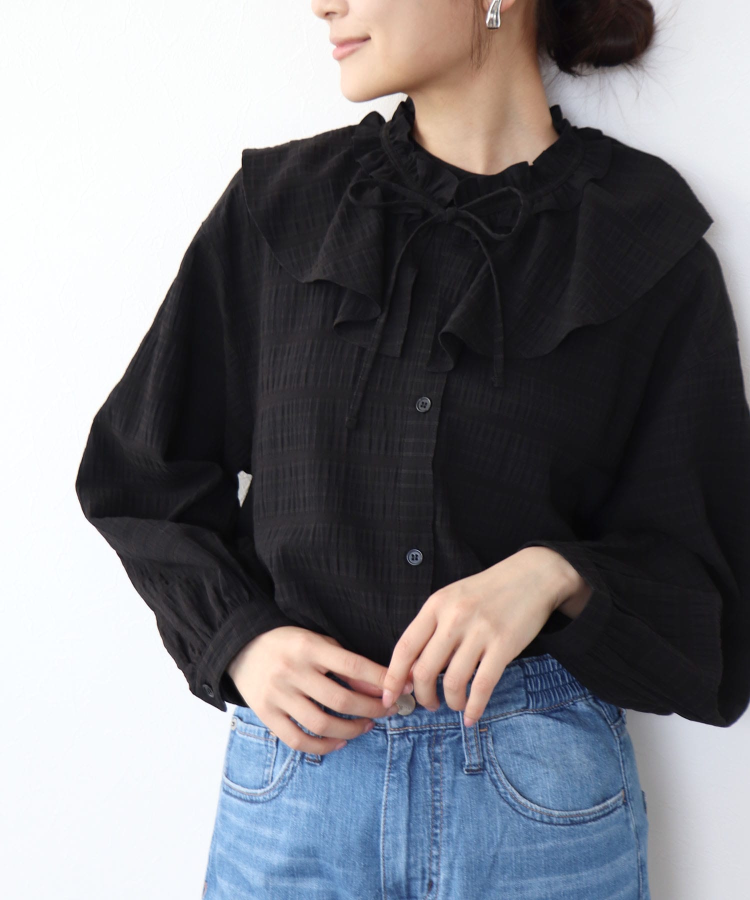 動きのあるフリル衿が華やかさを添えるシャツブラウス。