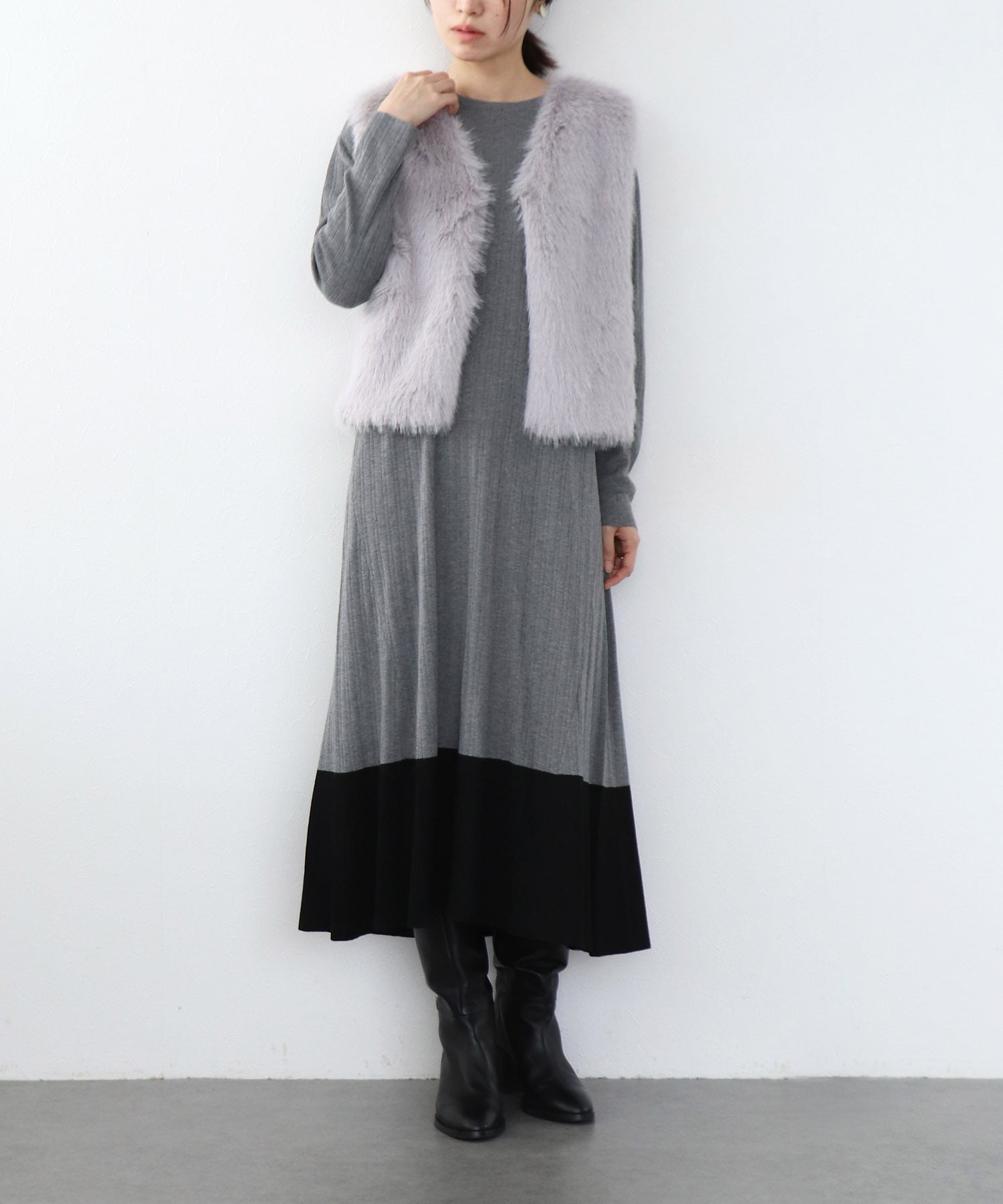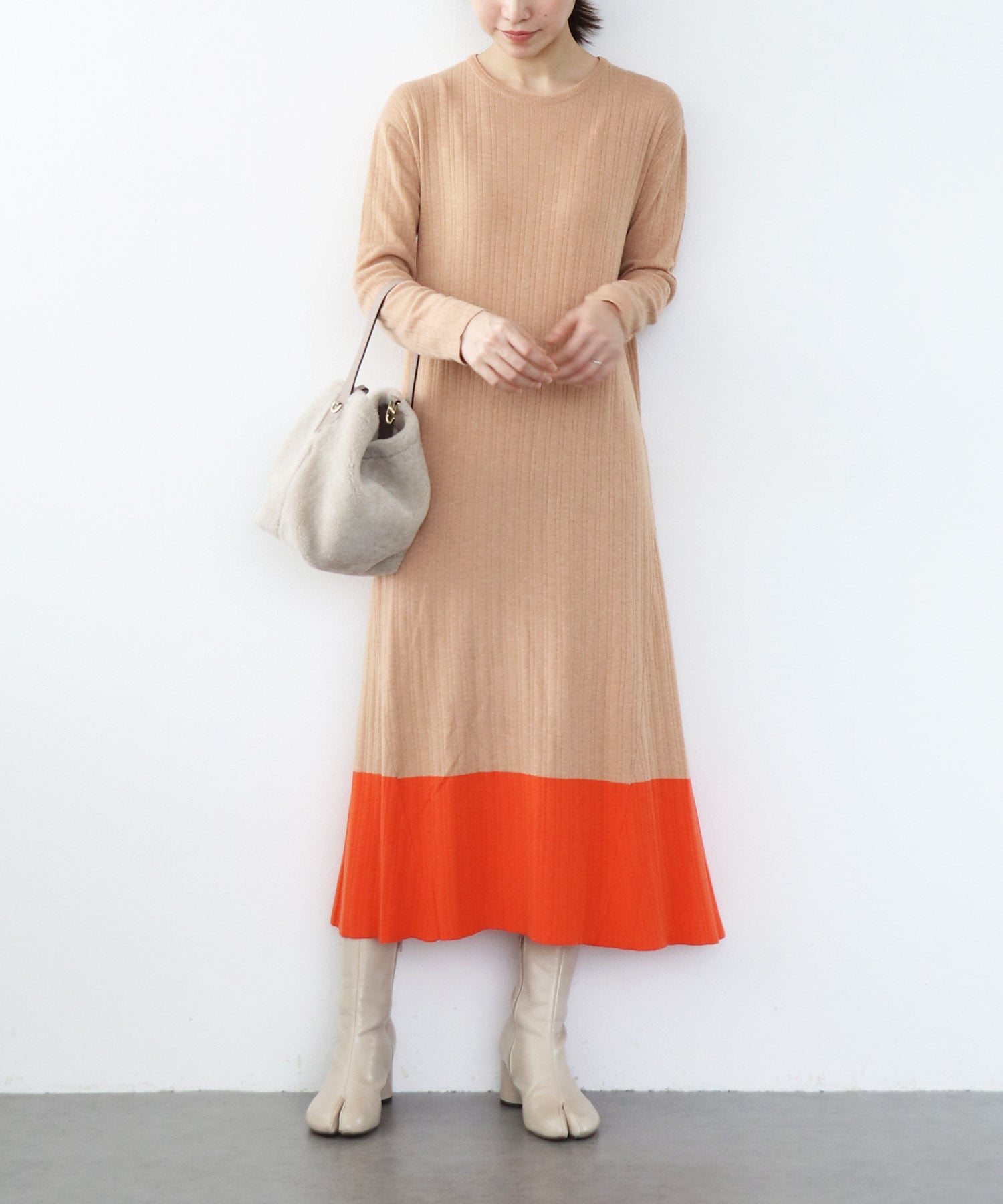 上質なカシミヤ混素材を使用し、柔らかくしなやかな肌触りが魅力の「カシミヤ混バイカラーAラインワンピース」。バイカラーのデザインがシンプルながら洗練された印象を演出します。