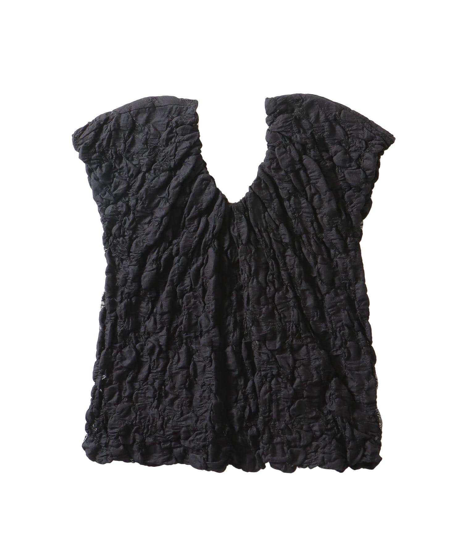 チュール部分の繊細な縮みと、コットン糸による柄部分の収縮差が立体感を生み、奥行きのある表情を演出。