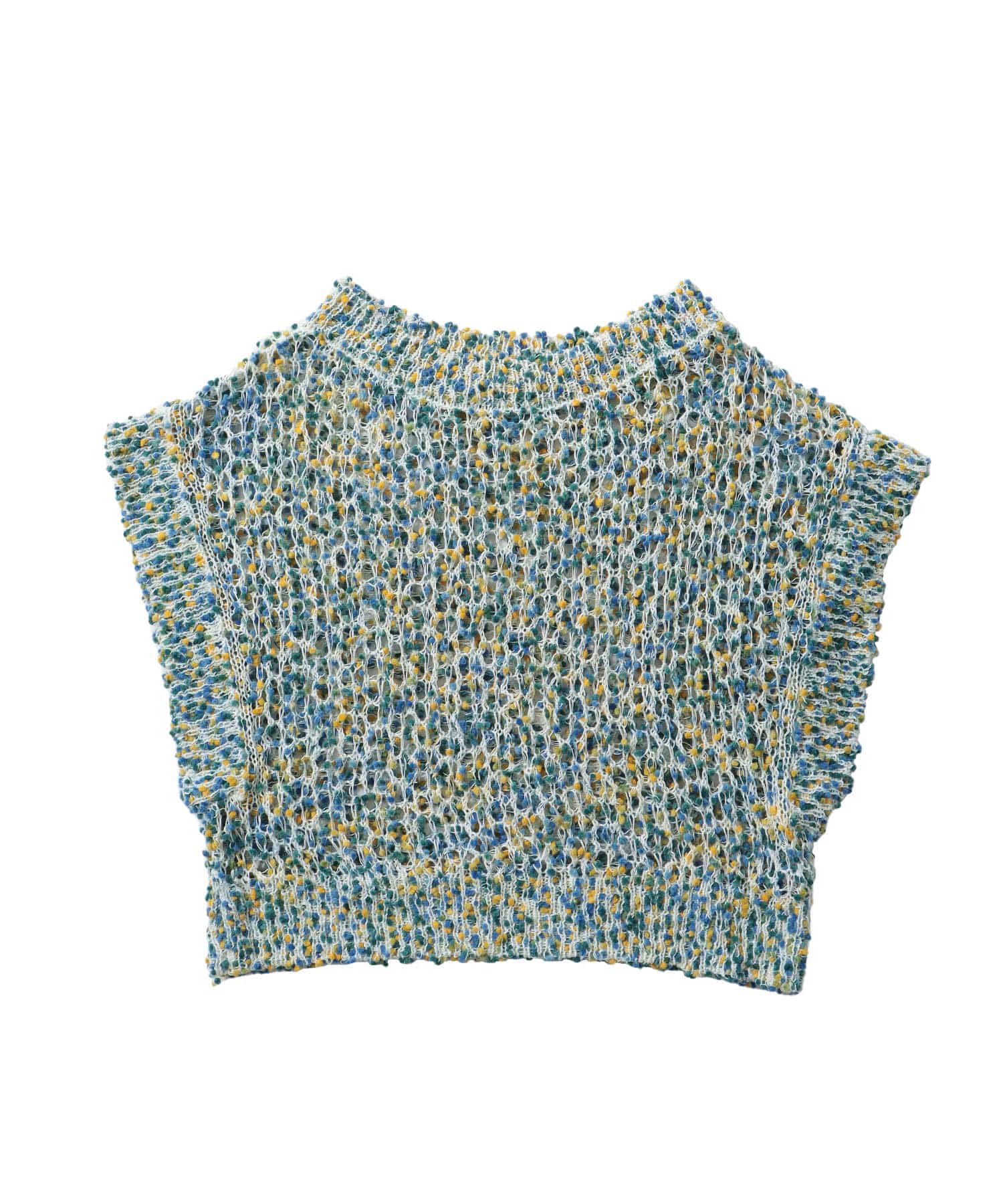 スイーツのような小さなポンポンが連なる糸を使用し、メッシュ編みに仕立てたプルオーバー。