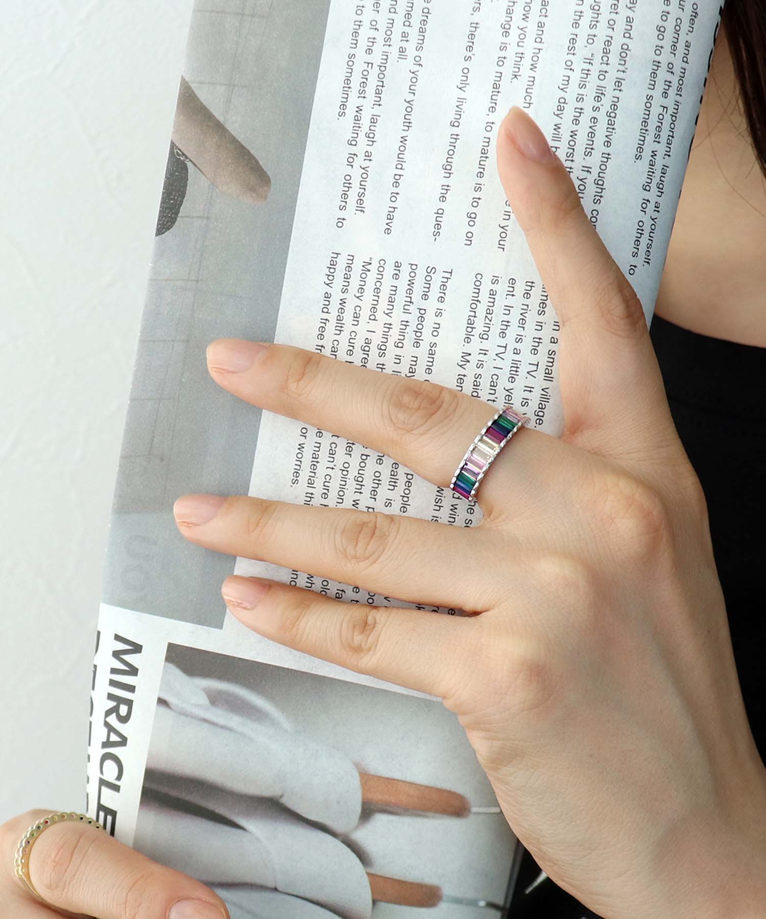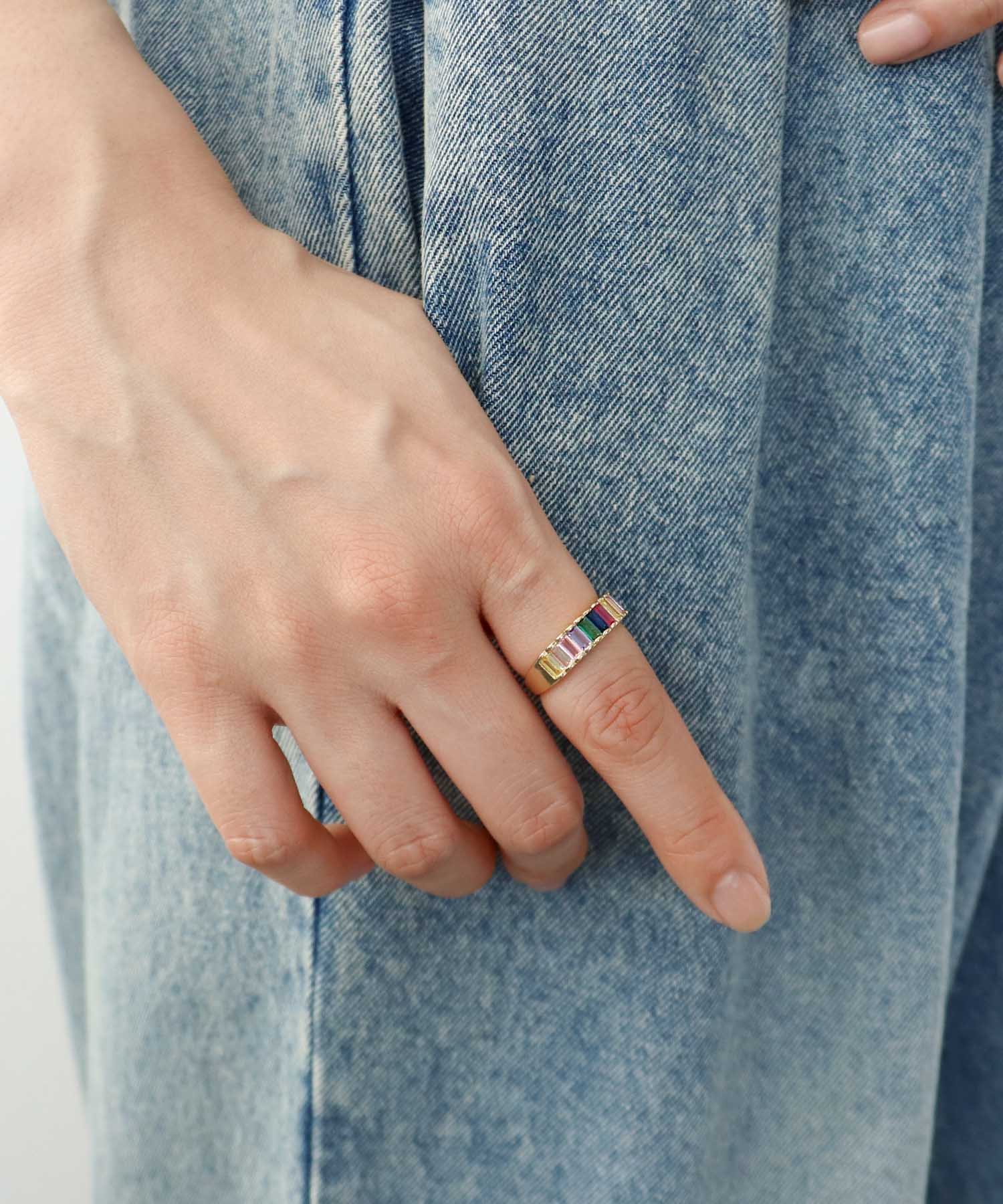 レインボーのキラキラしたストーンが綺麗なデザインのリング。