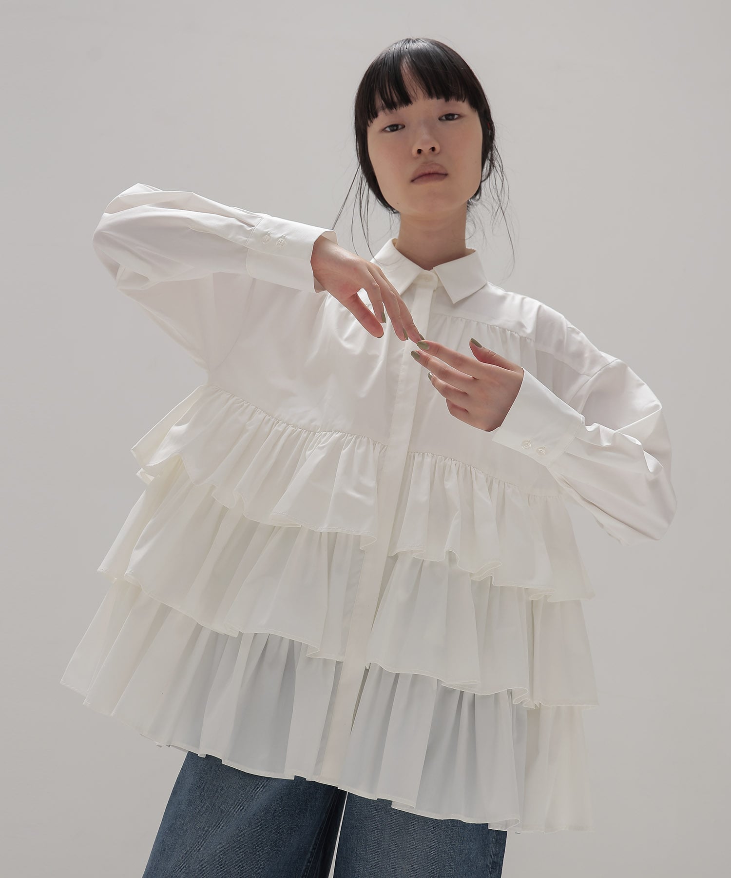 ボリュームのある三段フリルが目を惹くシャツチュニック。
