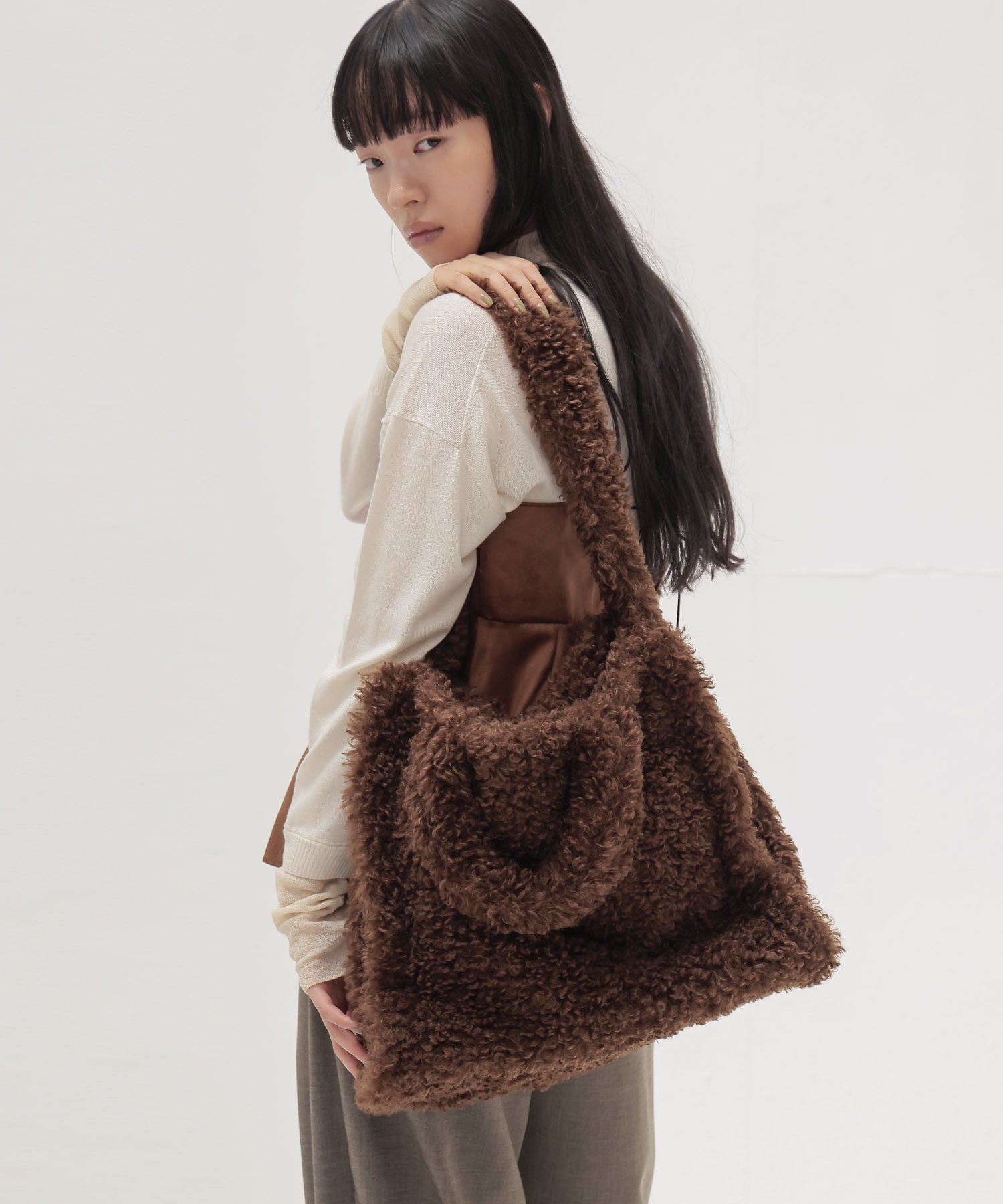 持ち手やショルダー部分までボア素材で仕上げられ、思わず抱きしめたくなるような愛らしさが魅力。