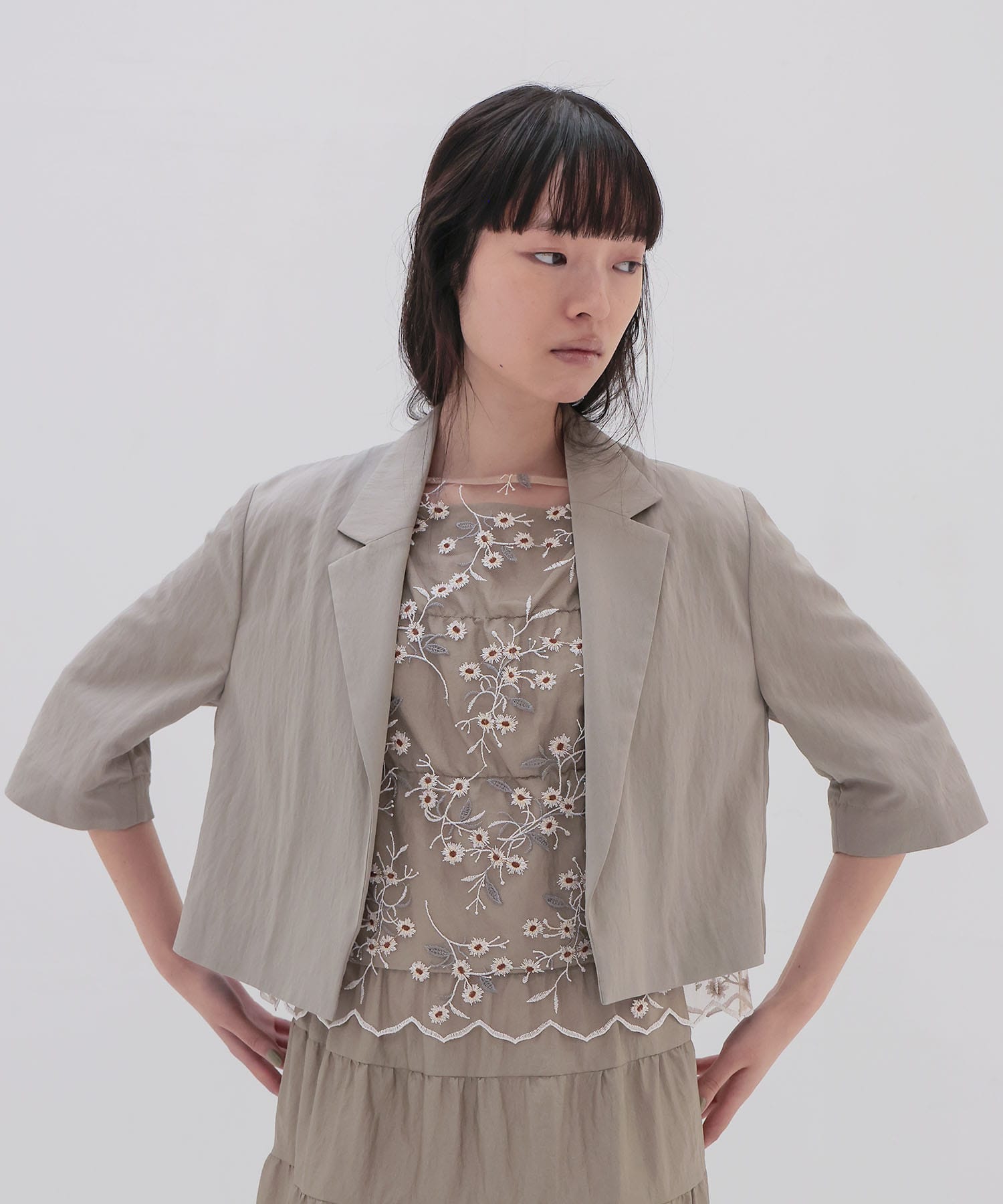 一枚仕立ての軽やかなライトアウターで、冷房対策としてもさっと羽織れる一着。