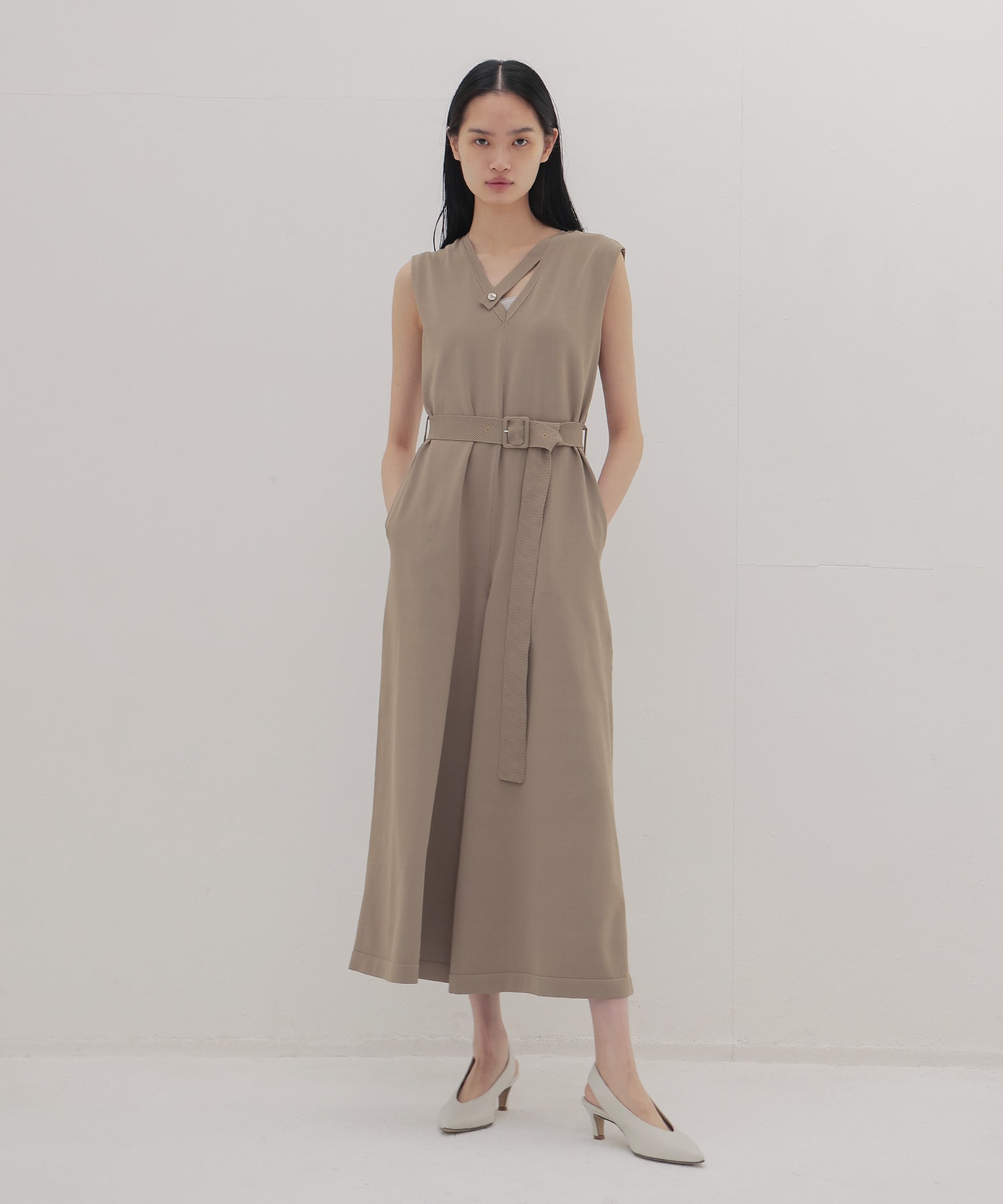 付属の同糸で編み立てたベルトでウエストマークすることで、メリハリのあるシルエットに。