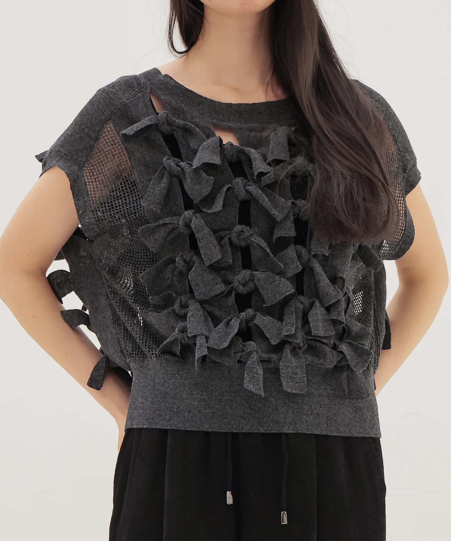 その名の通り、前後にたっぷりと配した共糸のリボンが目を引く、インパクトのあるニットプルオーバー。