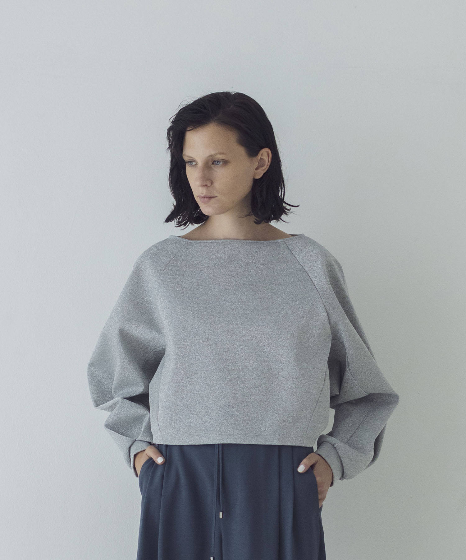 肌があたる裏面はコットンがまわるようにし、着心地の良さと表面のラメの光沢感を共存させた意匠素材。
