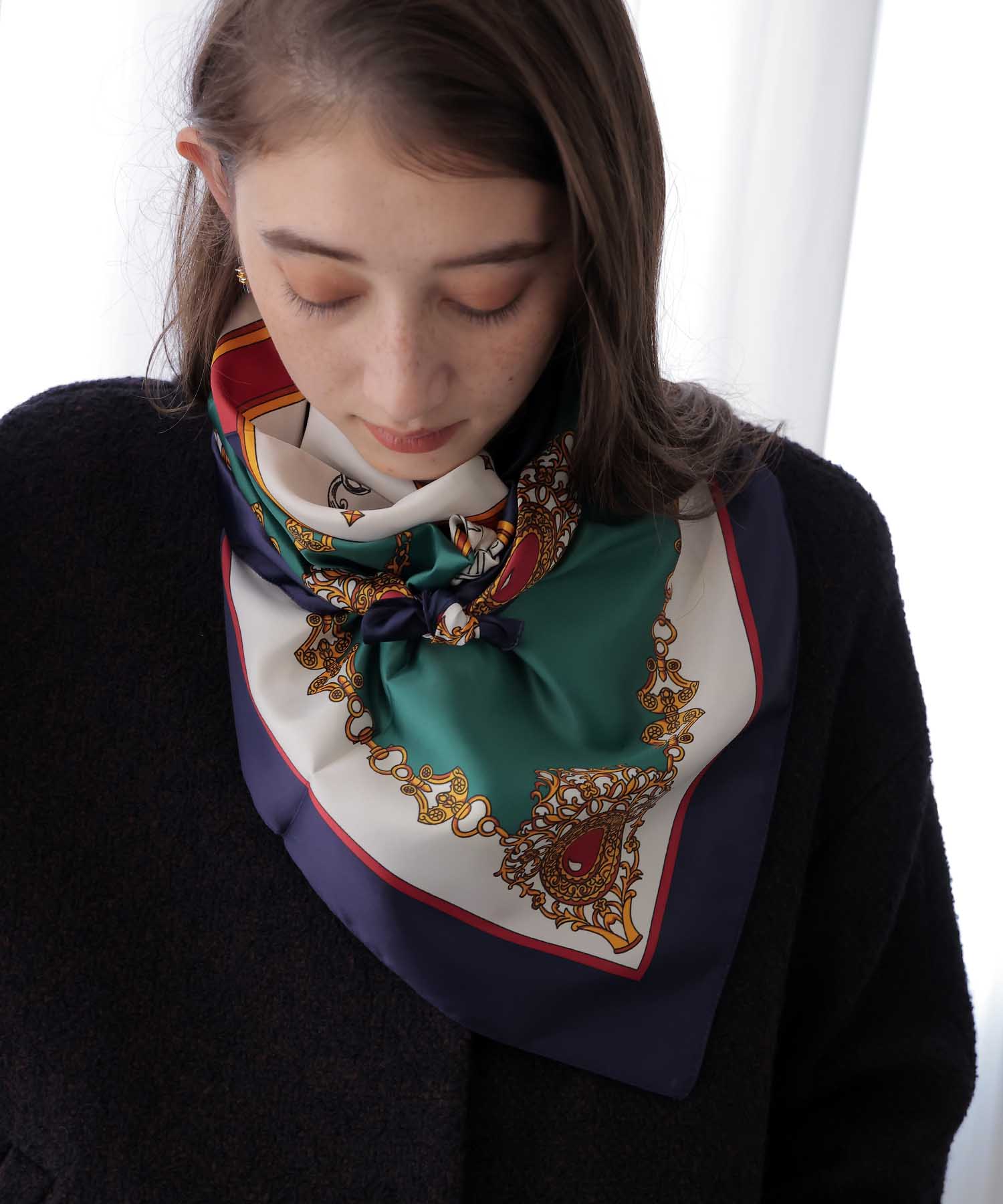 90×90cmの大判サイズで、首元やバッグのアクセント、ヘアアレンジにも活躍。