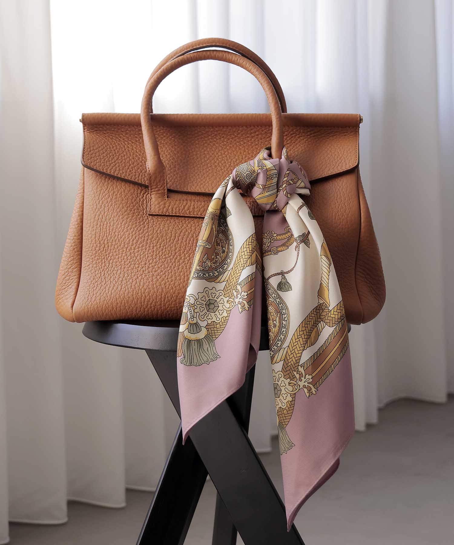 上品さと存在感を兼ね備えた、両面プリント仕様のエルメス風スカーフ。