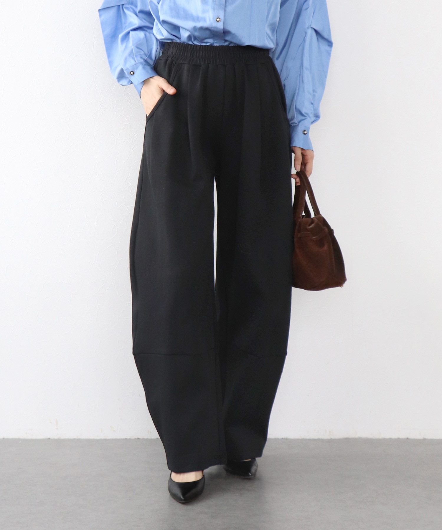 ウエストは総ゴム仕様で、リラックス感のある穿き心地ながらも、きれいめ見えするのがポイント。