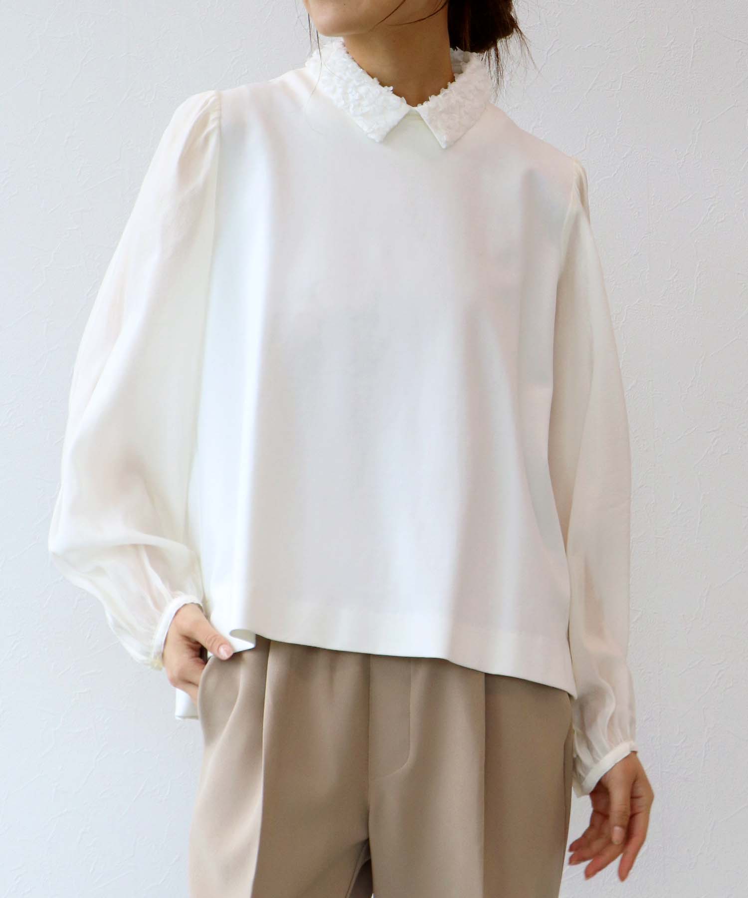 透け感のあるスリーブと上品な衿デザインが目を引く、クラシカルな印象のトップス。