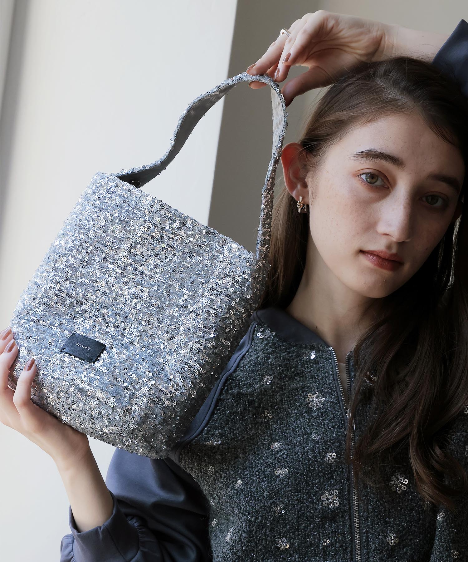 昼夜問わず幅広く活躍する、存在感抜群のスパンコールバッグ。