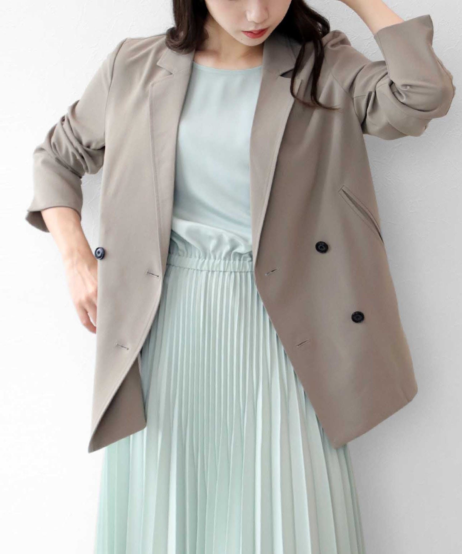 フロントに施したダブルボタンディティールがアクセントのジャケット。