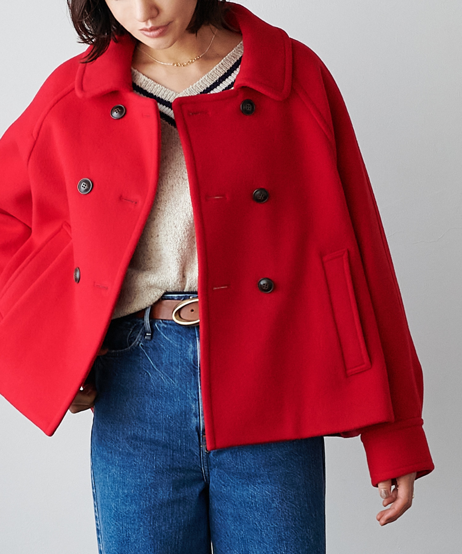 クラシックなPコートデザインに、コンパクトなシルエットが絶妙なバランスを生み出し、どんなコーディネートにも馴染みます。ダブルボタン仕様で防寒性も高く、冷たい風をしっかり防ぎつつ、軽やかな着心地を実現しています。