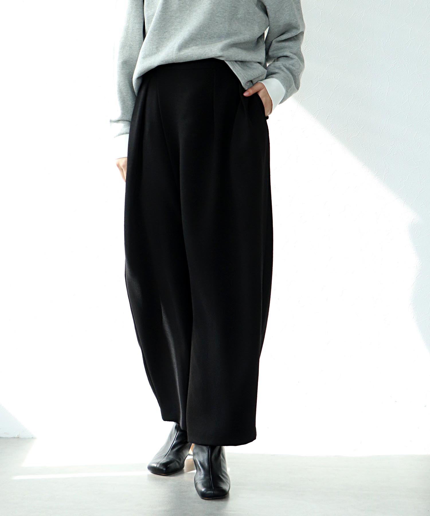 ハリと落ち感を兼ね備えたダブルジョーゼット素材を使用した、きれいめシルエットのタックパンツです。腰まわりに入ったタックが自然なふんわり感を生み出し、裾に向かってすっきりしたラインでまとめています。