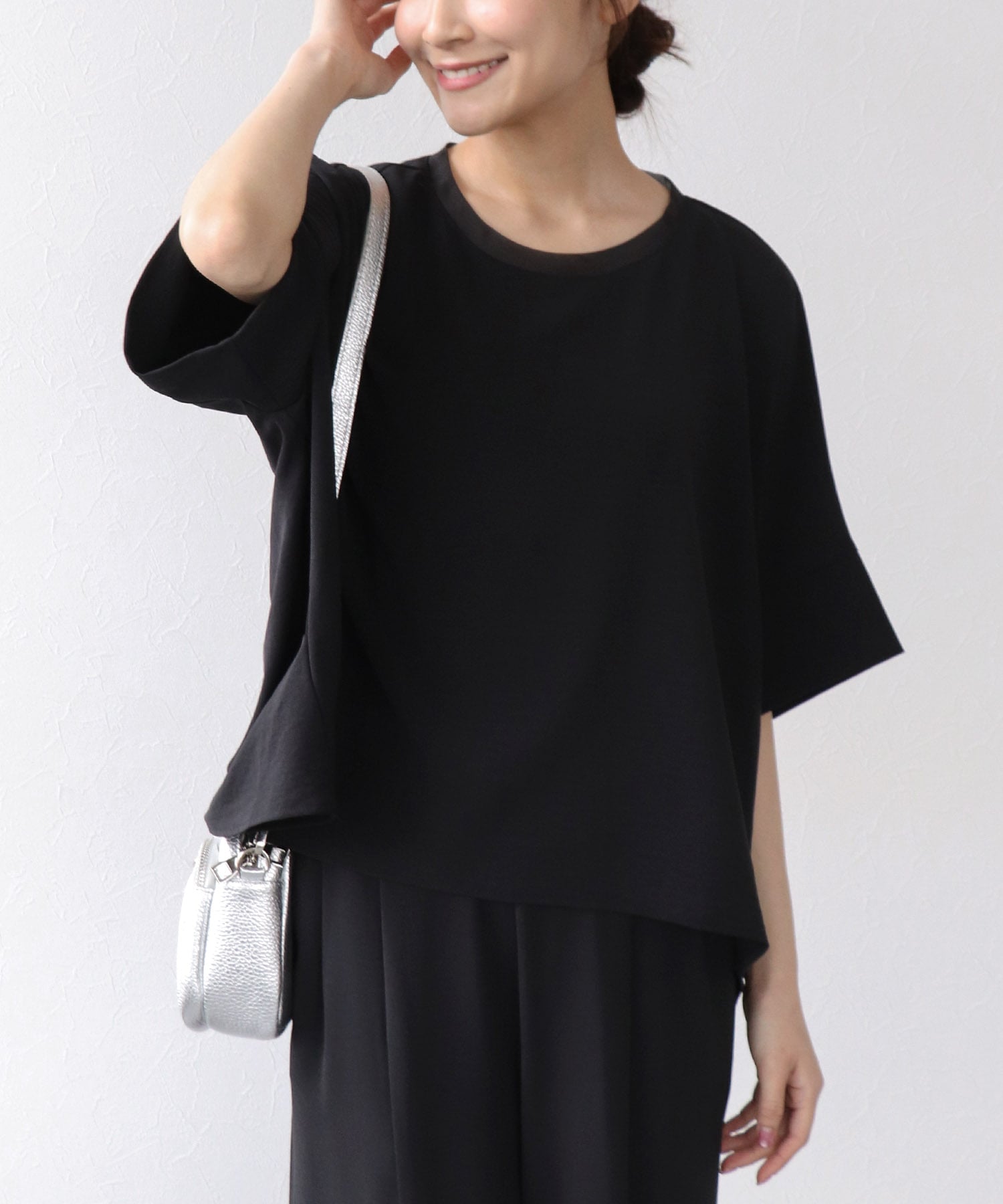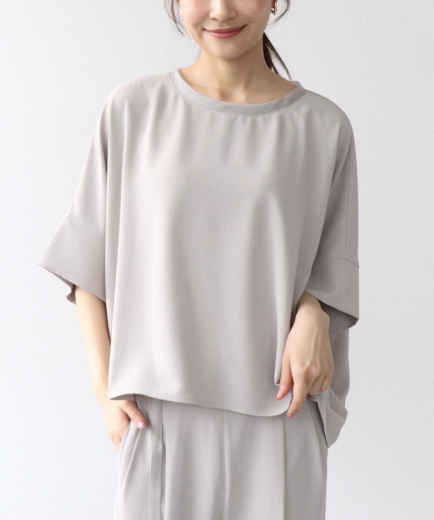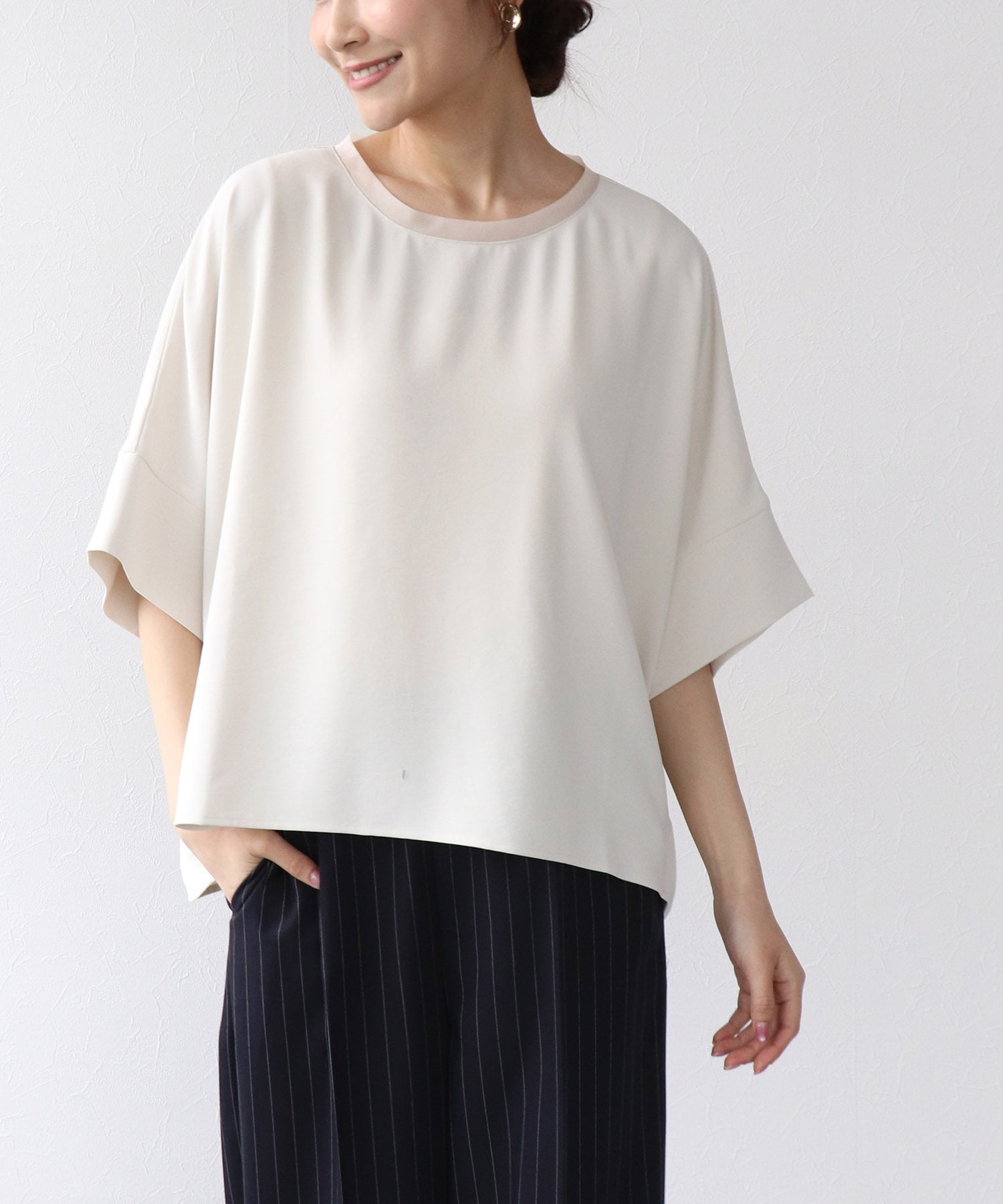 ゆとりのあるドルマンスリーブが気になる腕まわりをさりげなくカバーし、バランスの取りやすい着丈で様々なボトムと好相性です。