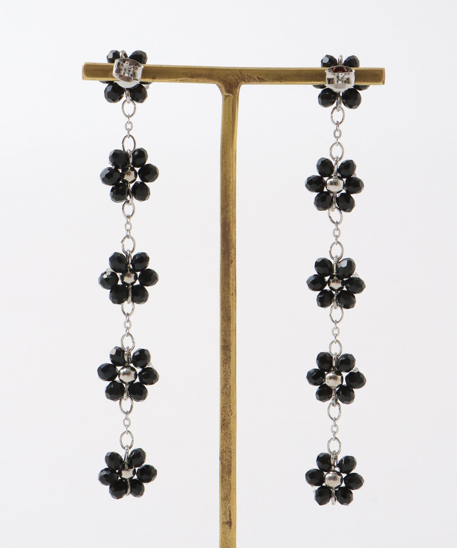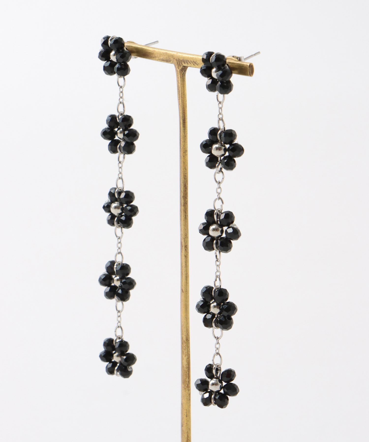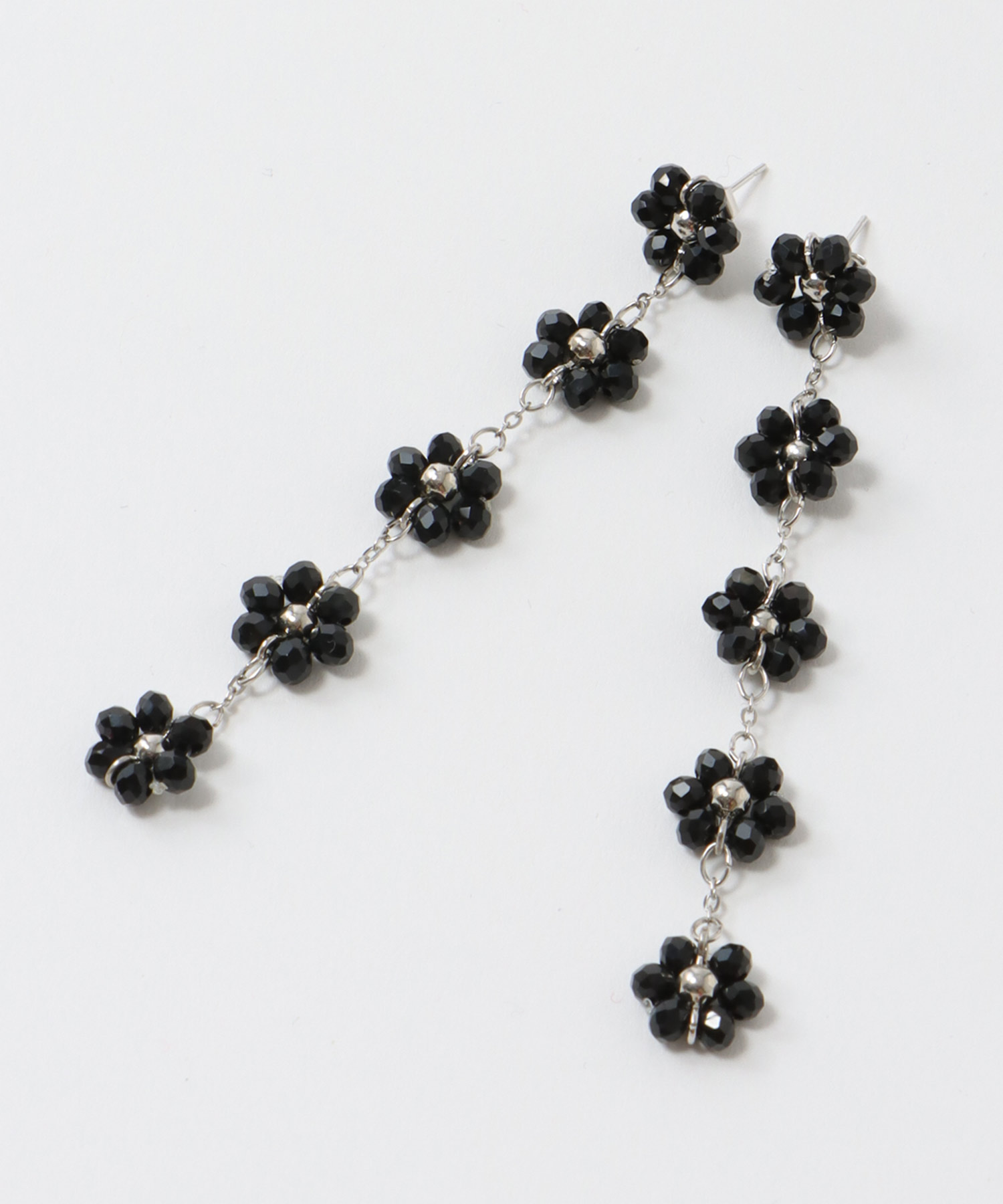 ブラックビーズで編んだフラワーモチーフのロングピアス