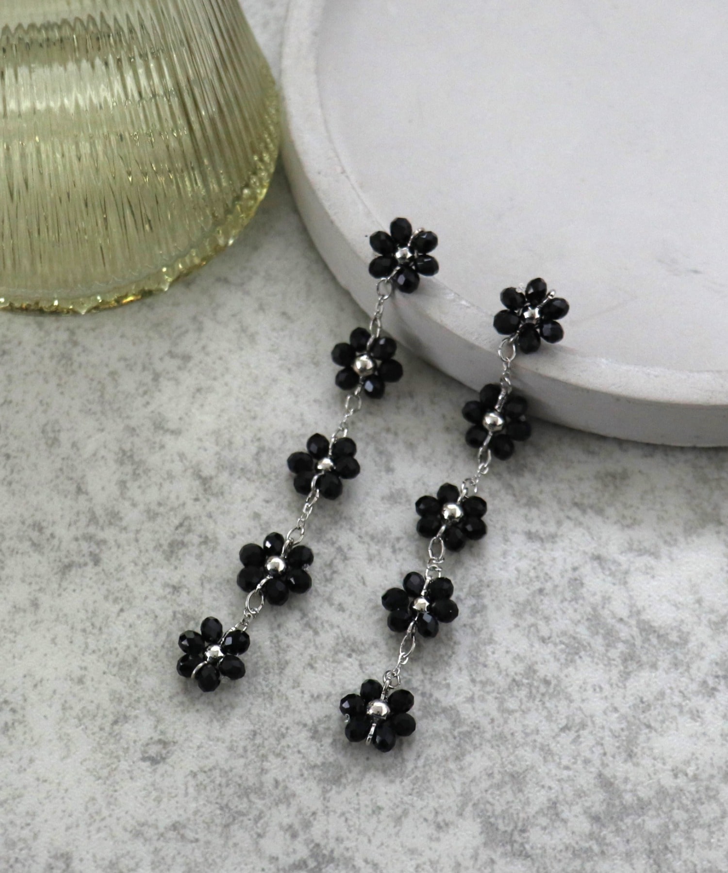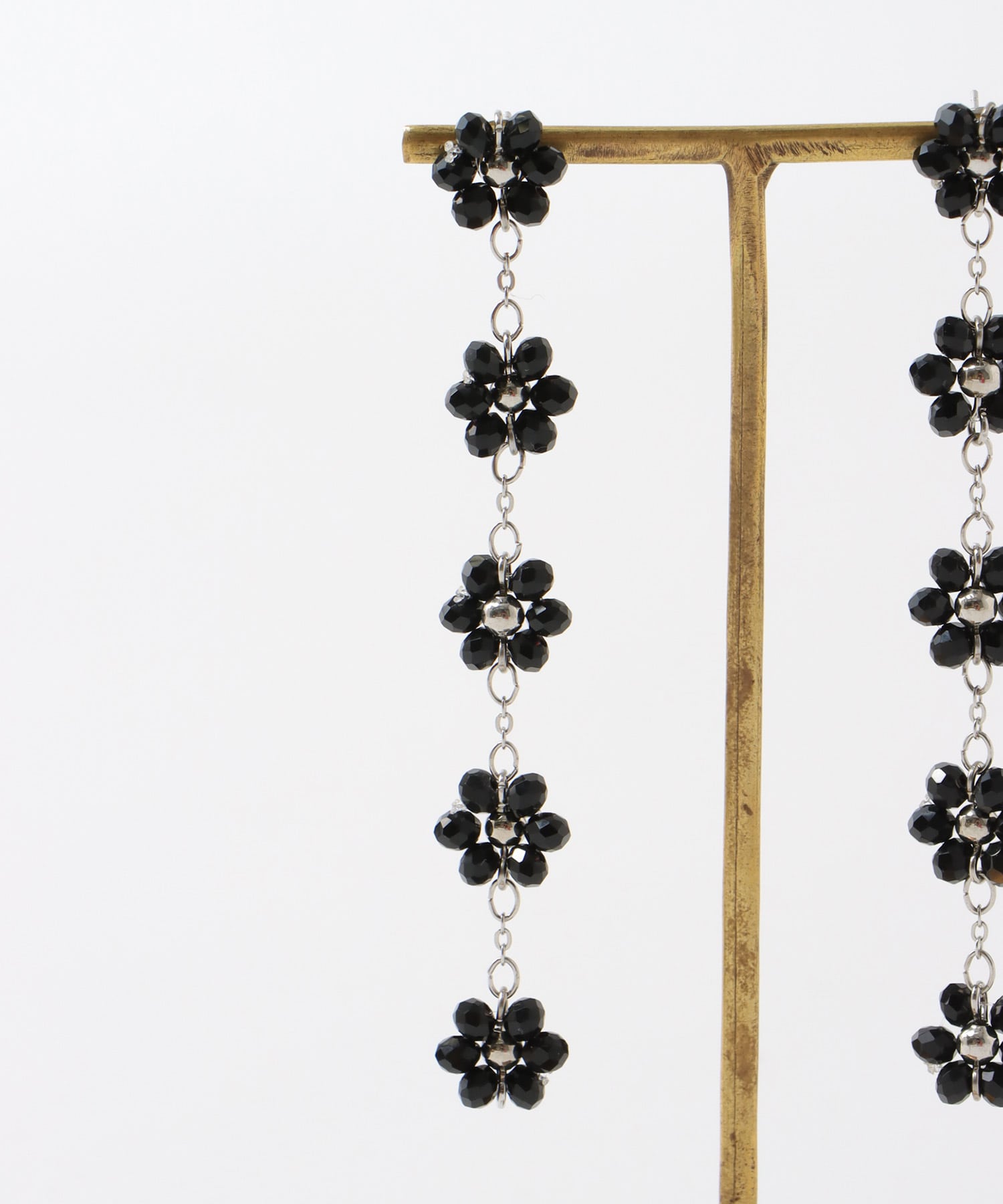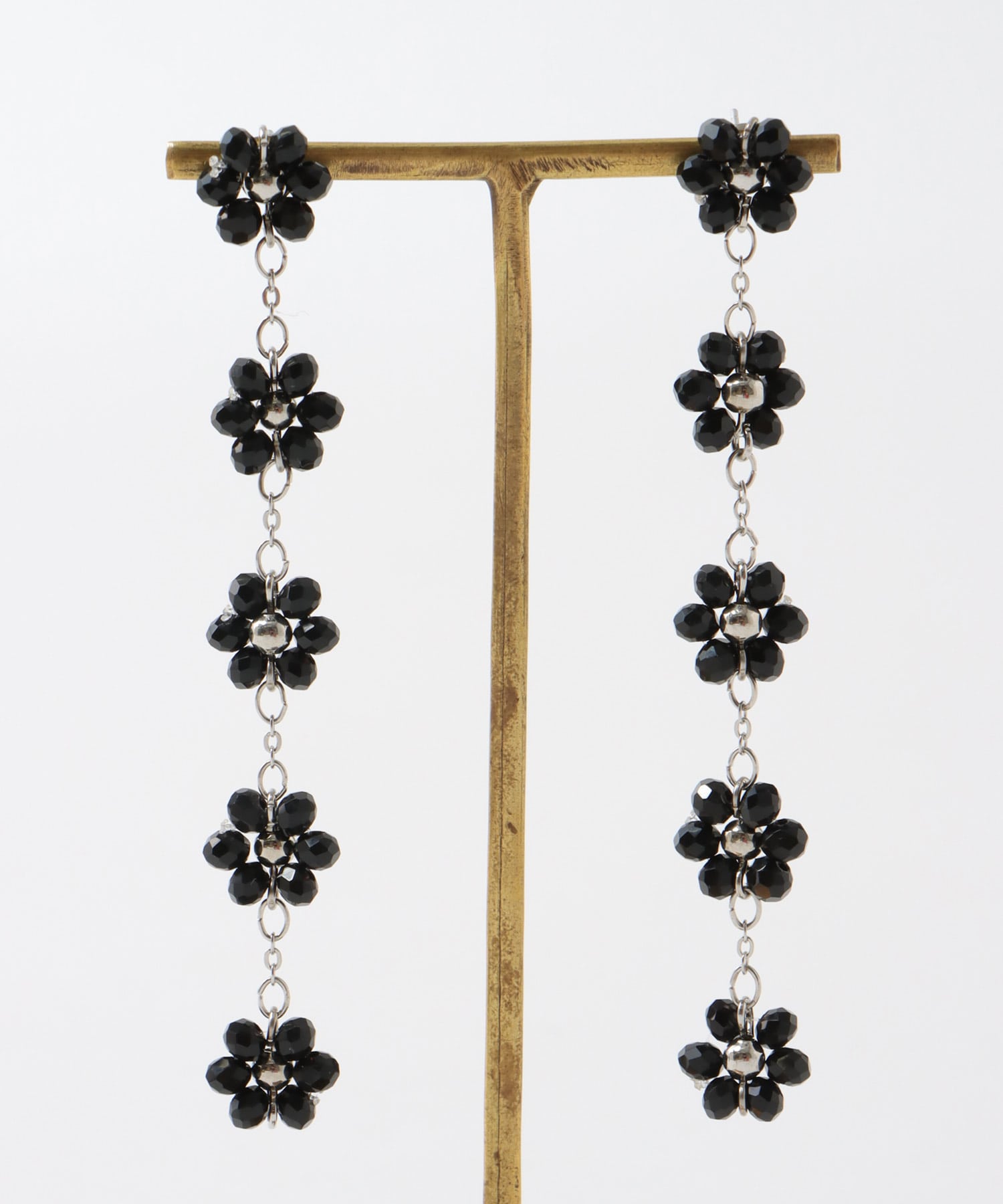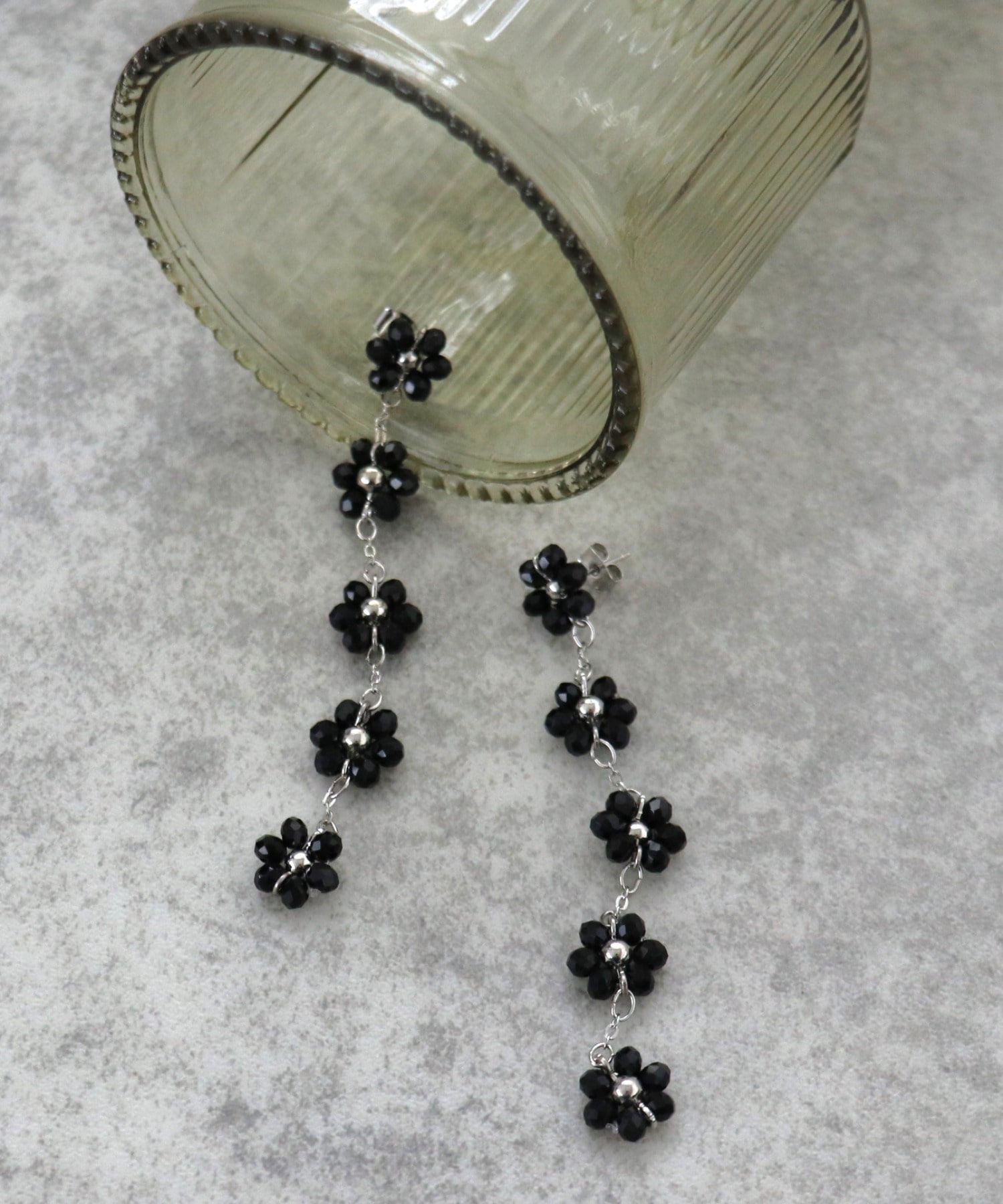 ブラックビーズで編んだフラワーモチーフのロングピアス