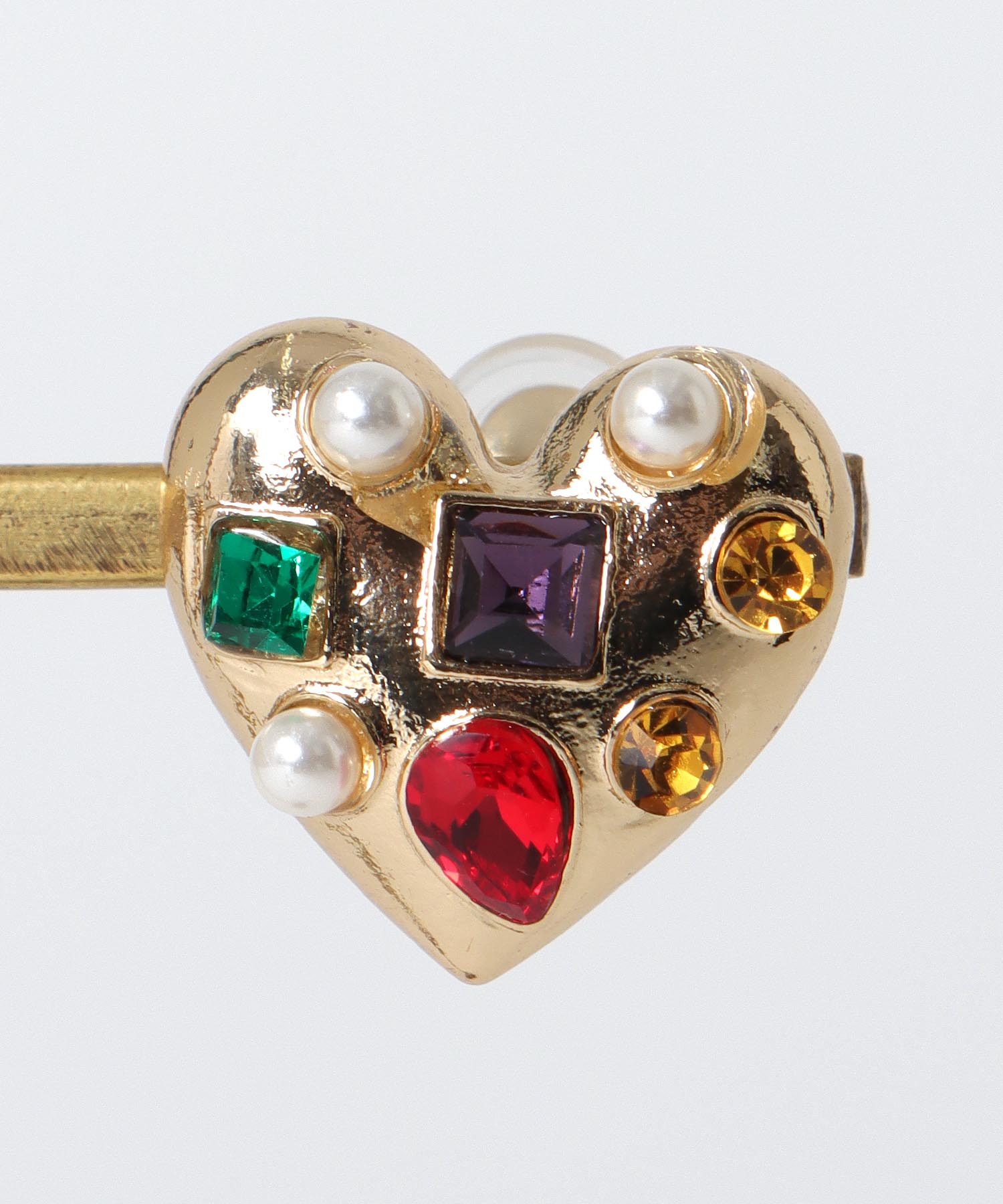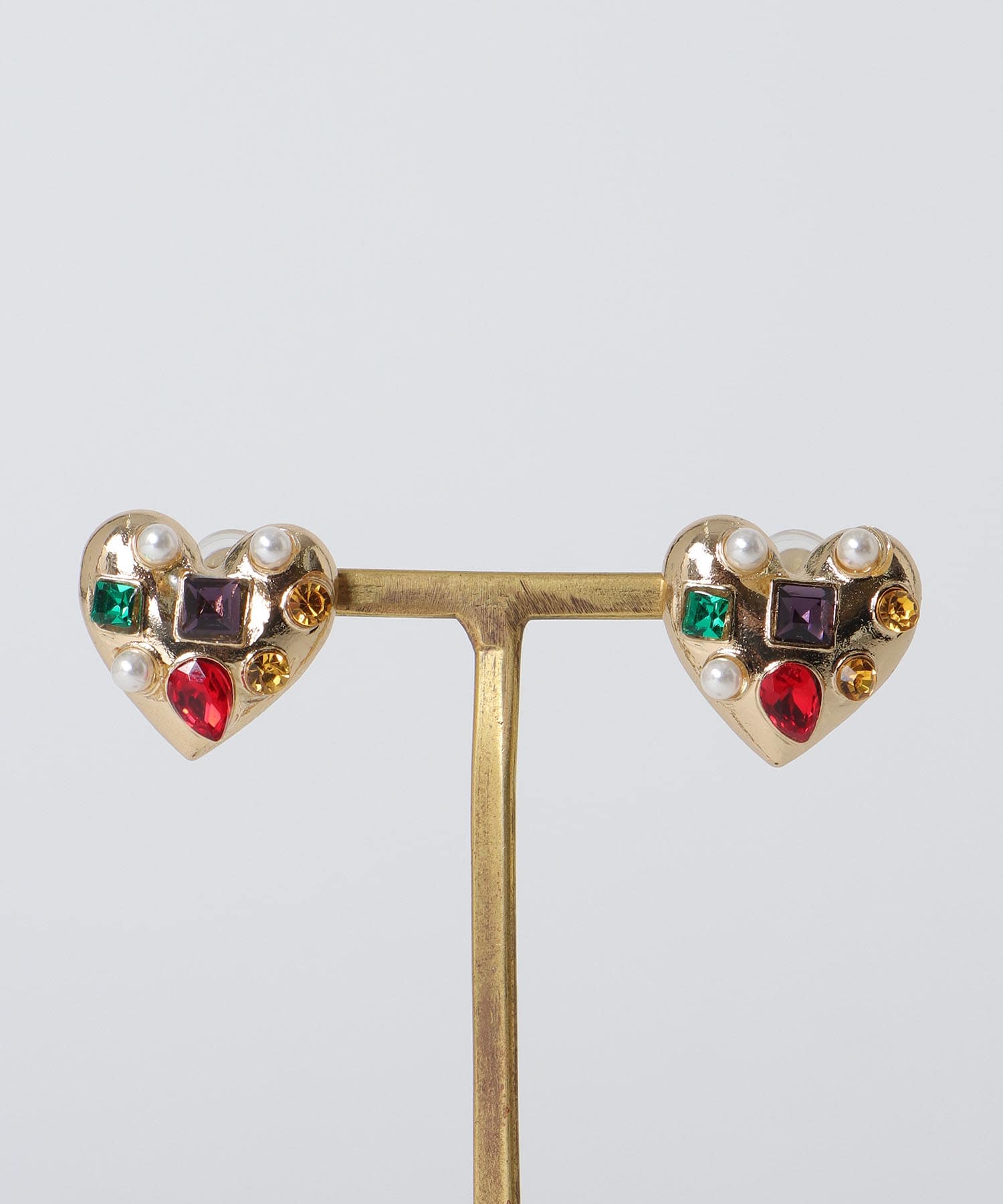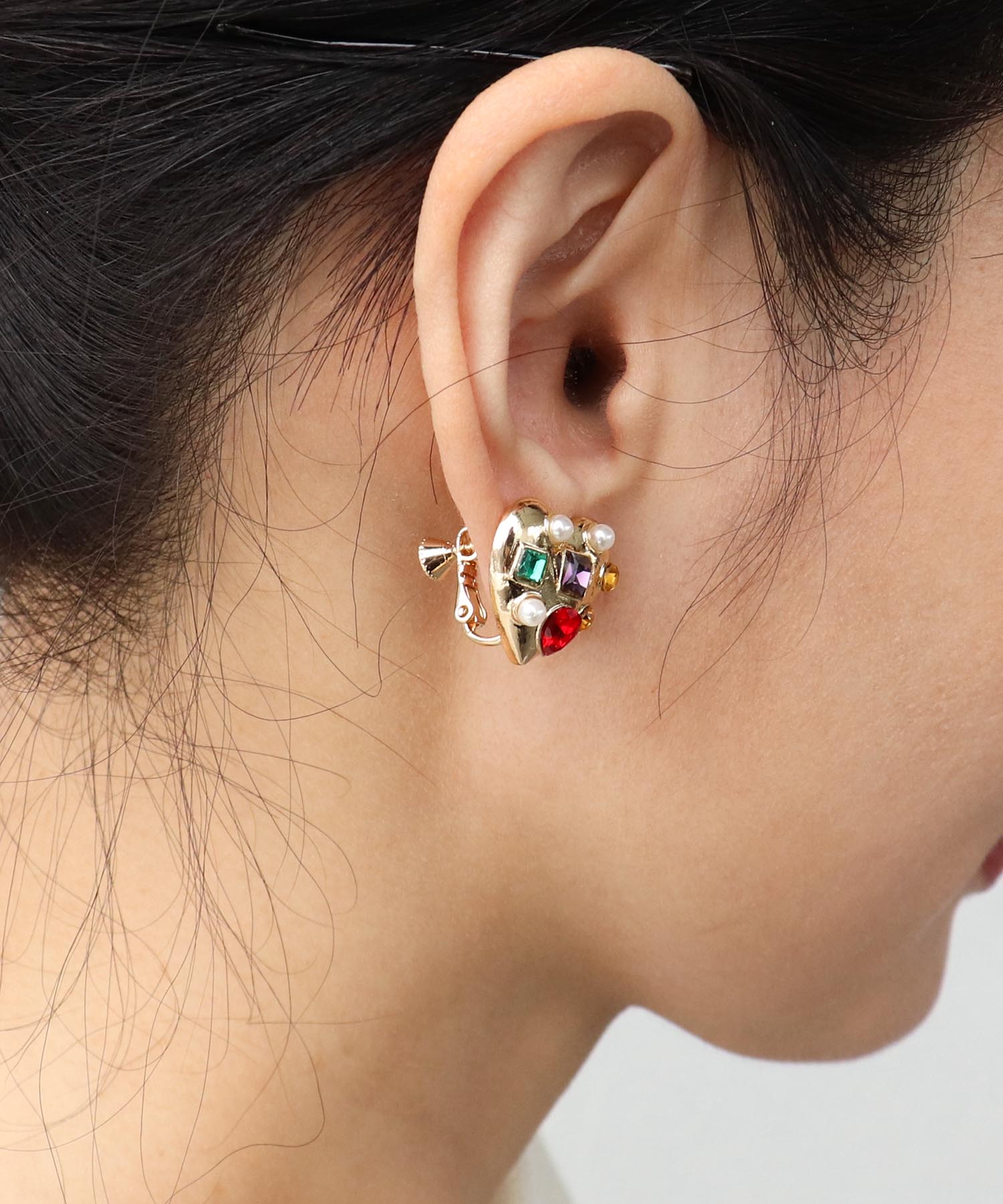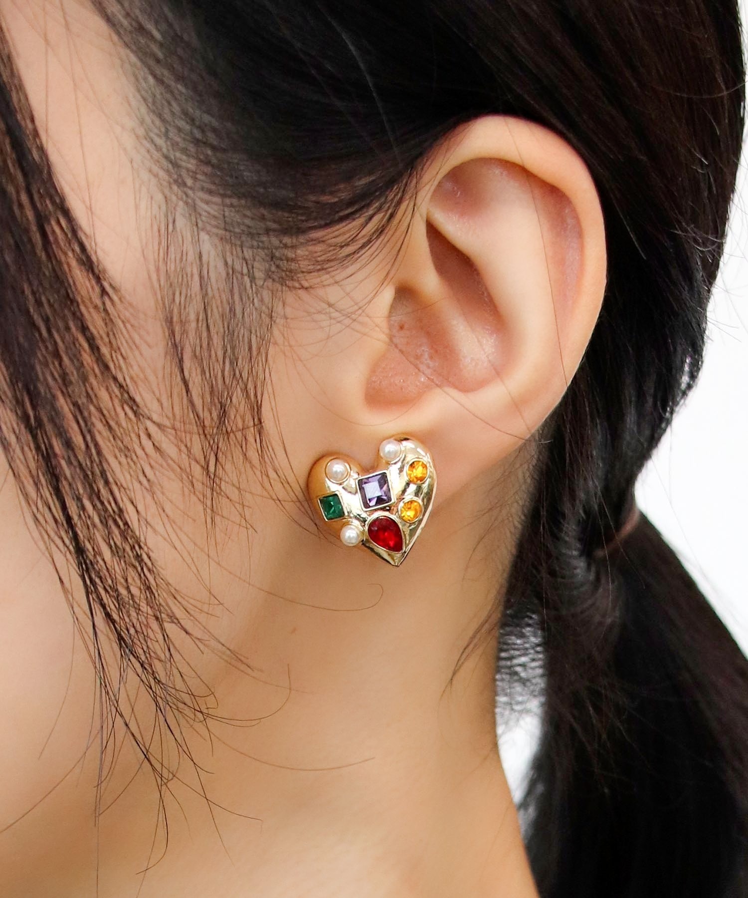 カラービジュやパールを大胆に散りばめた主役級のハートイヤリング?