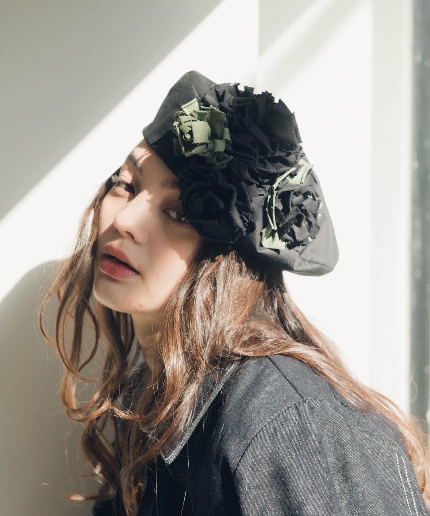 立体感のある共布フラワーモチーフが目を惹くデザインベレー。