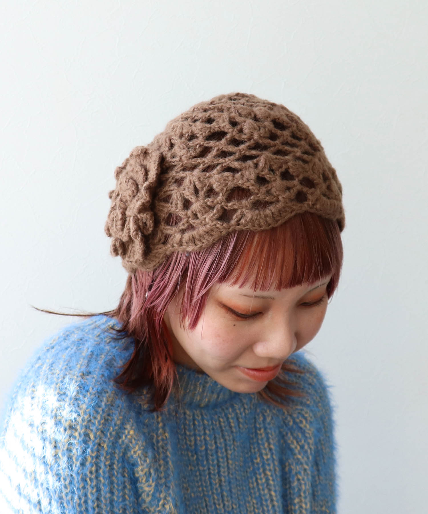 • 花モチーフ編みキャップ