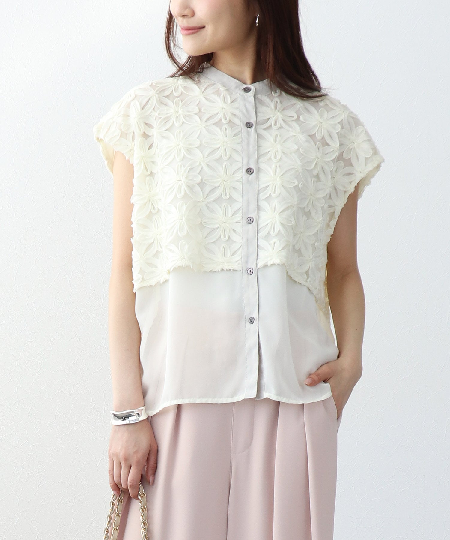 大きめのフラワーテープ刺繍が目を惹くデザイン✨お仕事やカジュアルなお出かけにもボトムを変えて着回ししていただきたいです✨