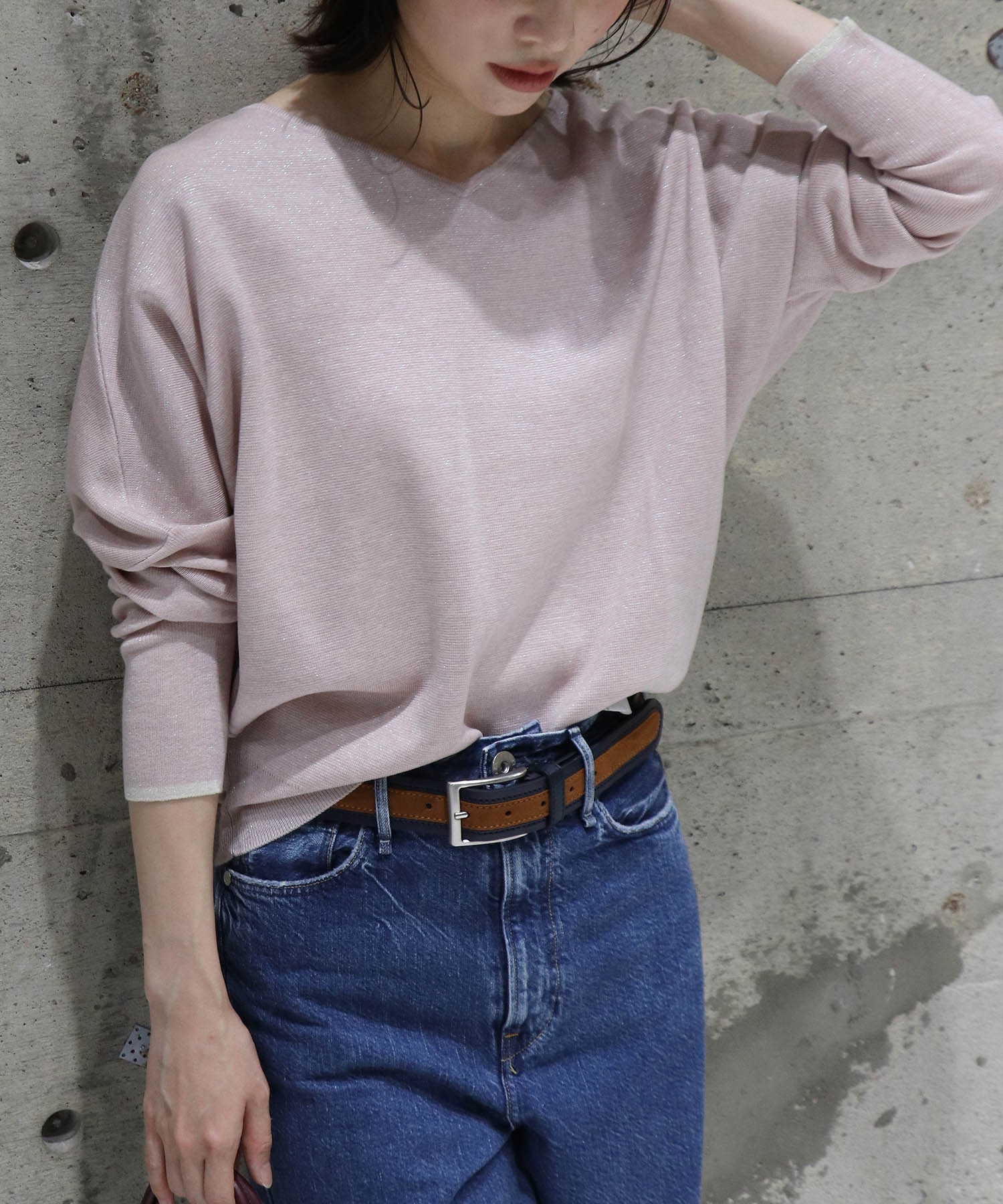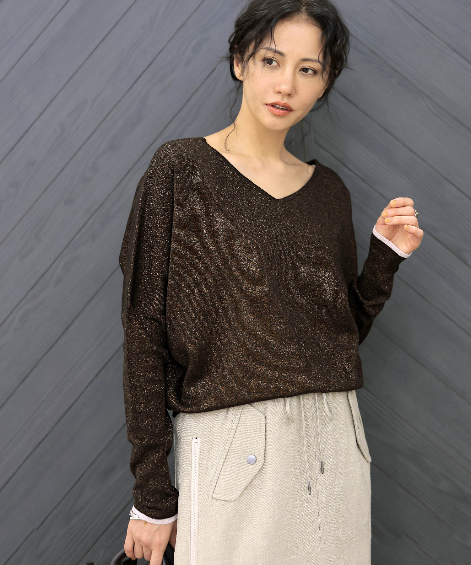 カーディガンの中に着用しているトップスは、ラメ感がしっかりとしている前後2wayで着れるドルマントップスとてもゆったりと着れる作りになっています。